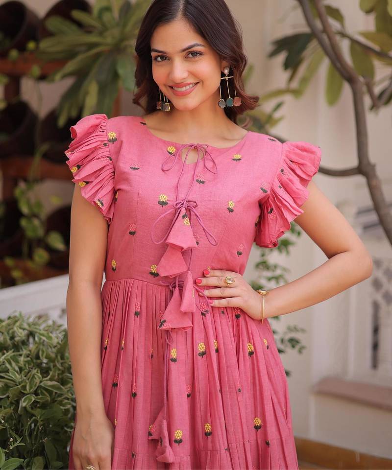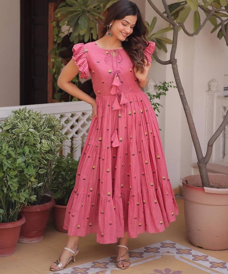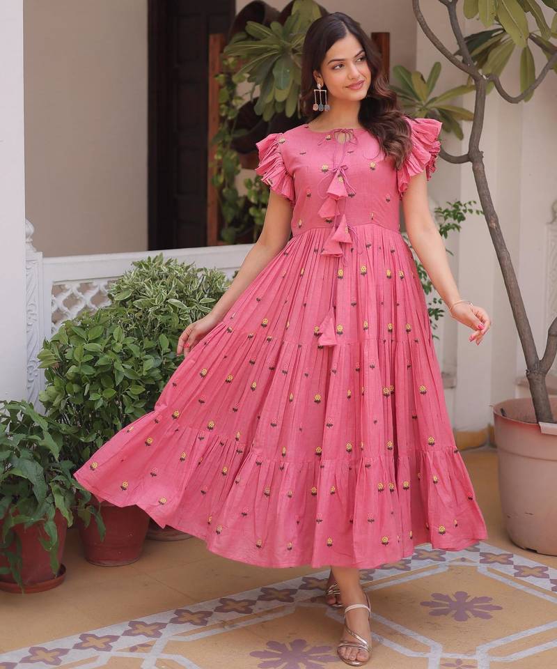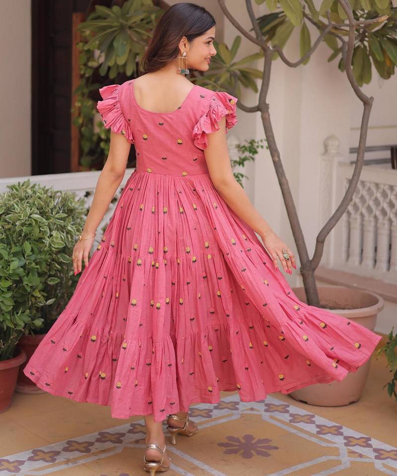 | Product Name | Pink Cotton With Embroidered Work Layer Dresses | |