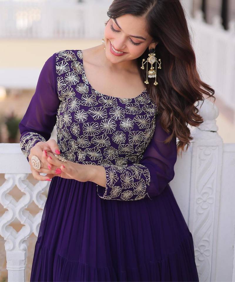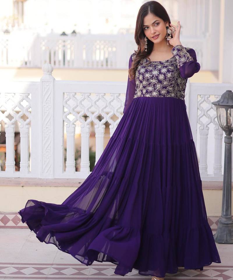 Purple faux georgette zari pipe embroidered work designer gown stitched