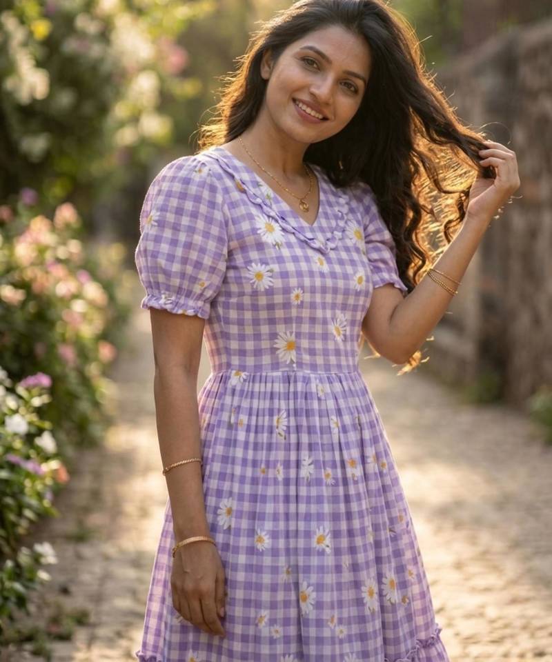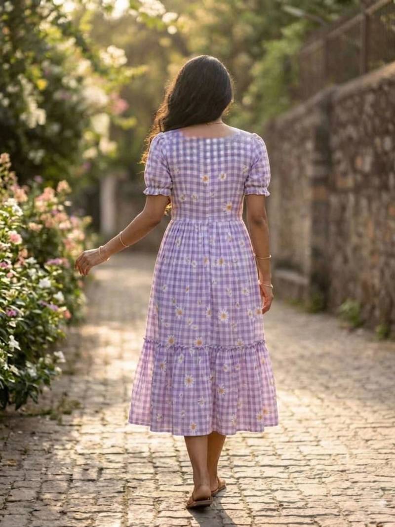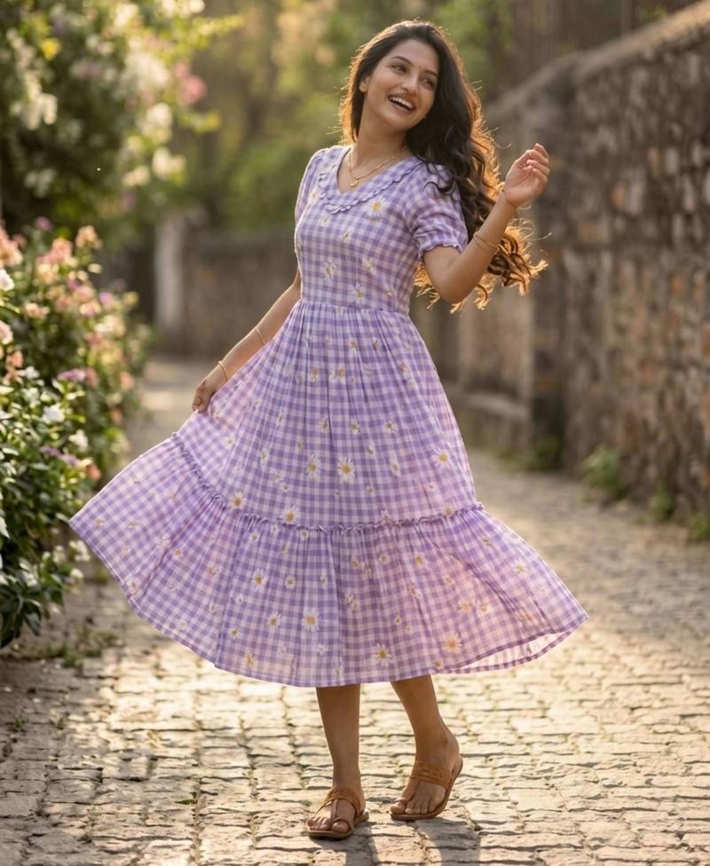 | Product Name | Purple Muslin Silk Printed Checked Fit And Flared Dresses | |