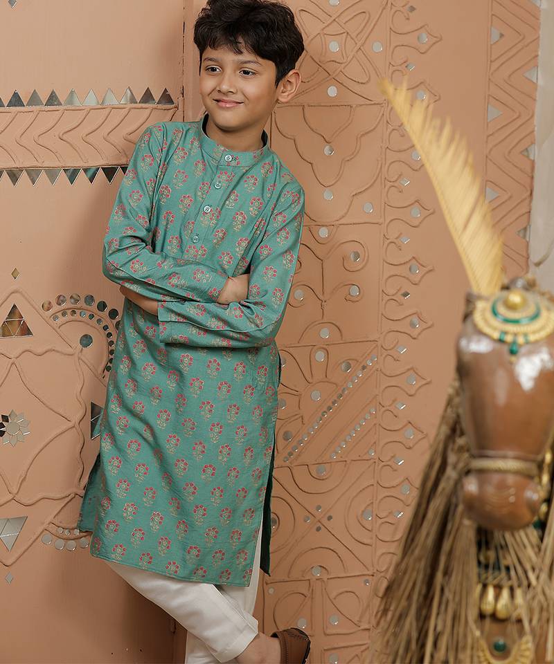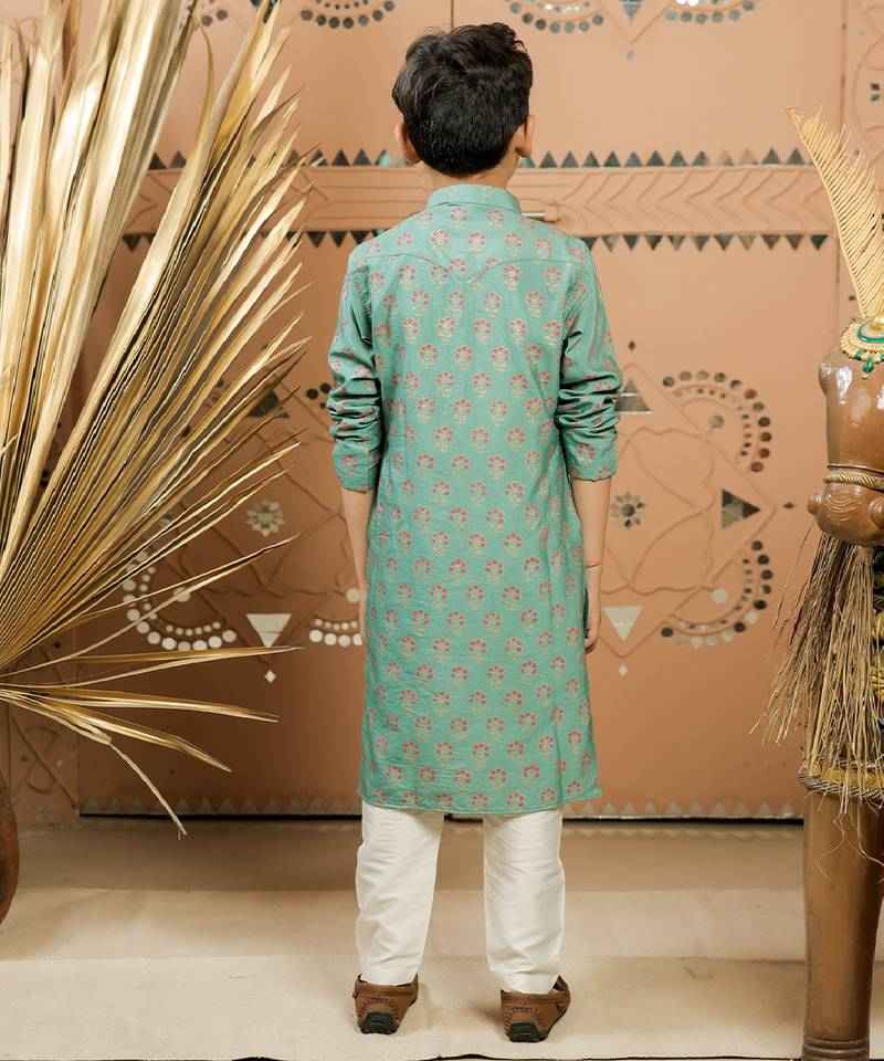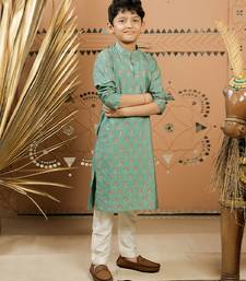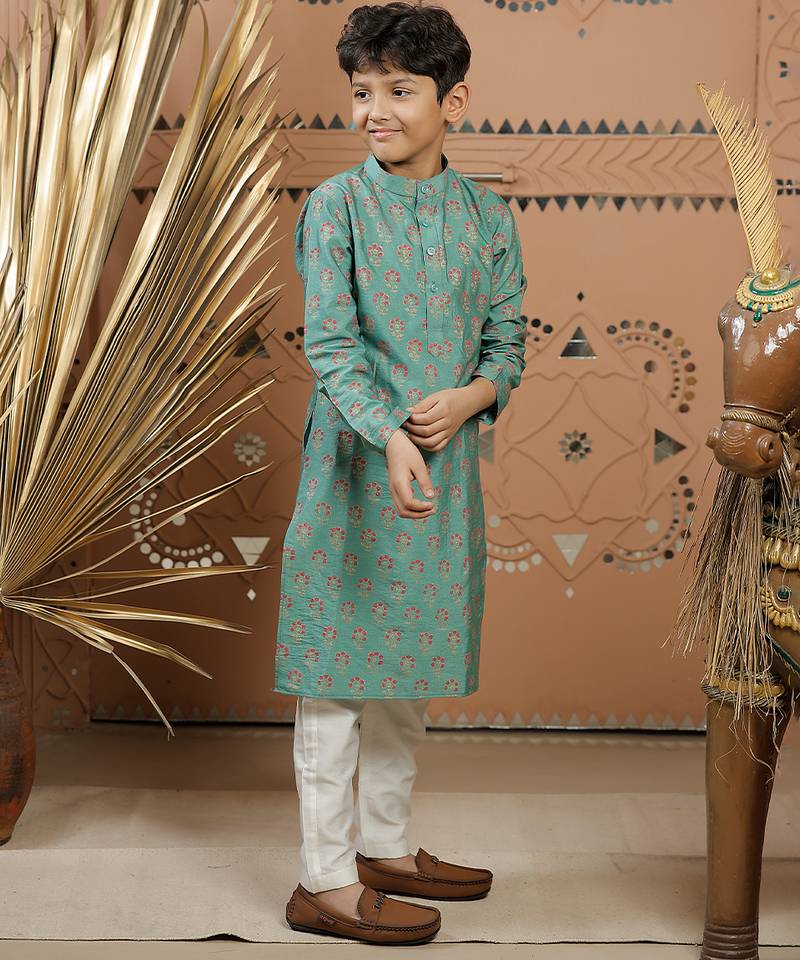 Teal green printed cotton silk kurta set