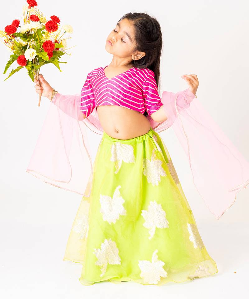| Product Description | Featuring Parrot Green Organza Lehenga With Pink Gota Detail Choli Set. |