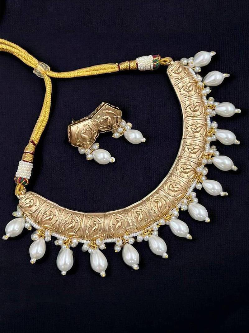 Product Description | Antique Gold Tone Finish With Premium Synthetic Pearls Intricately Engraved Base With Detailed Craftsmanship Bold Choker Style Enhanced With Alternating Large Teardrop Pearl Drops And Small Pearl Clusters Matching Engraved Studs With Pearl Hangings For A Coordinated Look Ideal For Traditional Weddings, Festive Wear, And Cultural Gatherings A Perfect Blend Of Heritage Artistry And Pearl Elegance, Making It A Statement Piece For Timeless Beauty. |