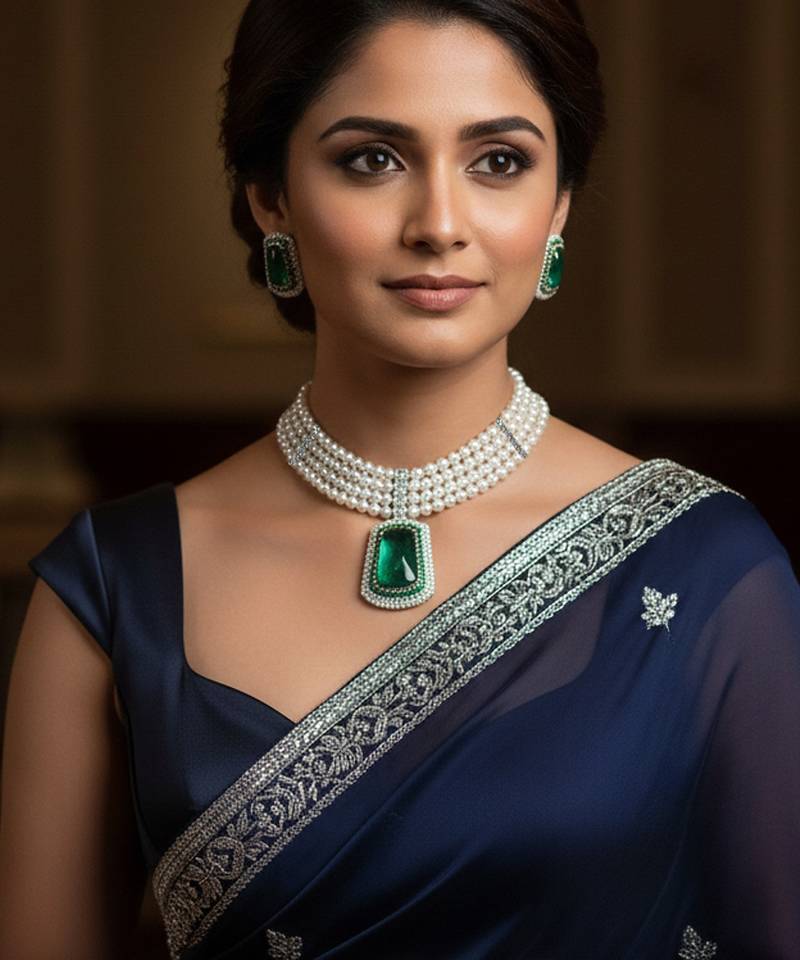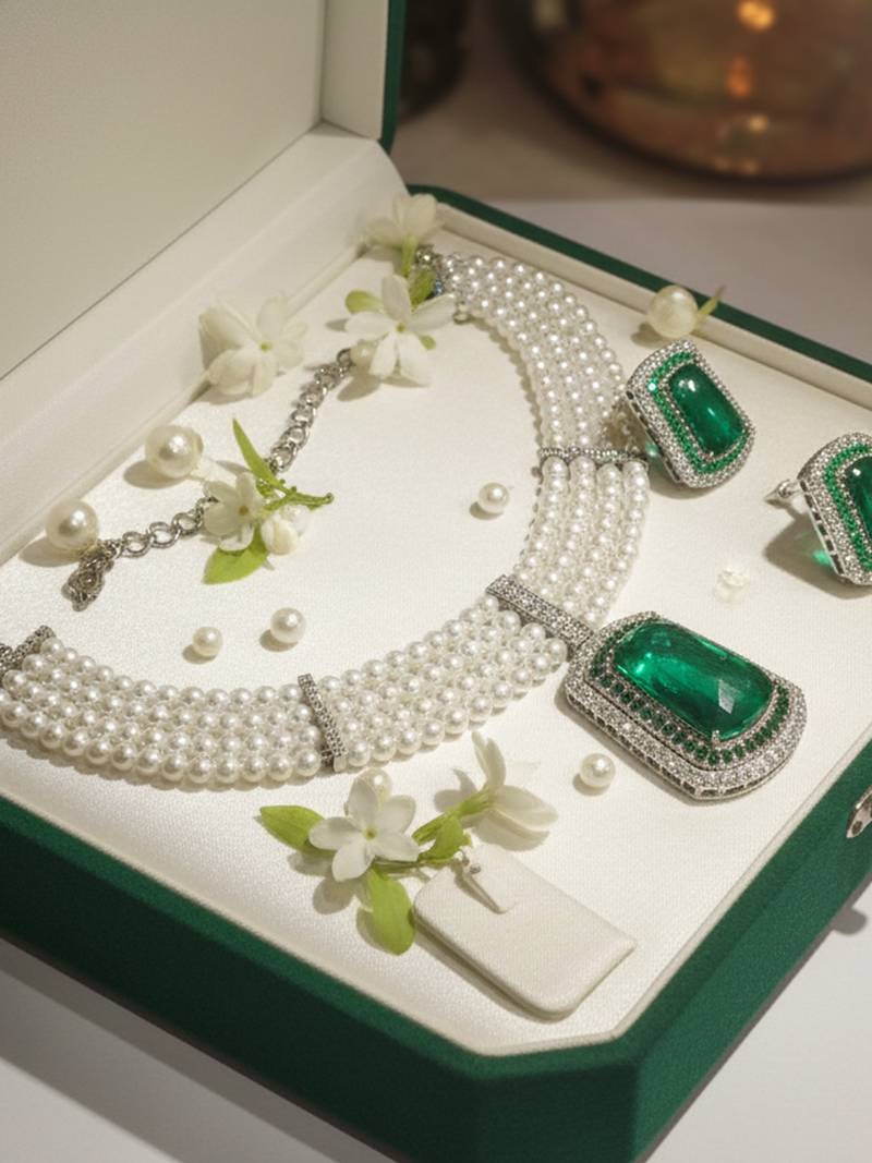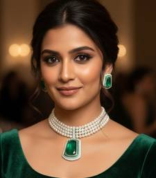 | Product Description | Beautiful Multi Layer Pearl Choker Giving A Rich And Classy Look.Large Emerald Green Stone Pendant Surrounded With Sparkling Stones.Matching Statement Earrings With The Same Bold Green Stone.Victorian Style Finishing For A Royal And Premium Feel.Perfect For Weddings, Parties, And Traditional Outfits. |