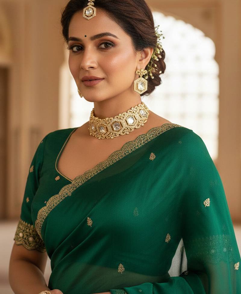 | Product Description | Made In Brass Metal With Rich Golden Plating.Decorated With Sparkling Moissanite Polki Stones For A Premium Shine.Enhanced With Cz Ad Stones For Extra Sparkle And Clarity.Comes With A Matching Choker, Earrings, And Statement Ring.Intricate Design Ideal For Weddings, Parties, And Festive Looks.Lightweight, Elegant, And Beautifully Detailed For Royal Styling. |
