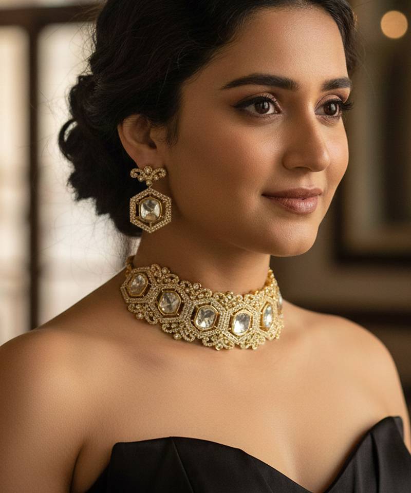 | Product Name | Golden Plated Moissanite Polki Choker With Matching Earrings & Ring | |
