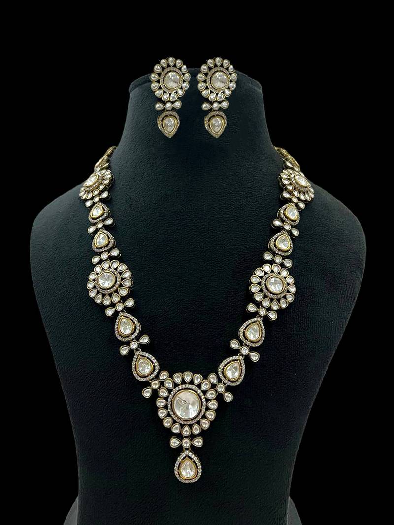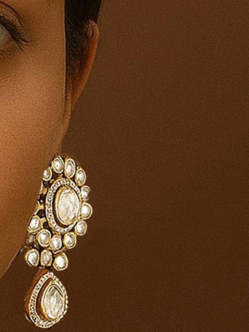 Product Description | Gold Tone Base With Premium Kundan Polki Stones. Alternating Floral Round Motifs And Teardrop Kundan Patterns For A Balanced, Royal Appeal Statement Design With A Prominent Central Pendant Highlighted By A Round Kundan Stone. Matching Circular Floral Studs With Teardrop Kundan Drops For A Graceful Finish. Perfect For Weddings, Receptions, And Cultural Celebrations. A Luxurious Blend Of Traditional Charm And Bold Statement Making Design. |