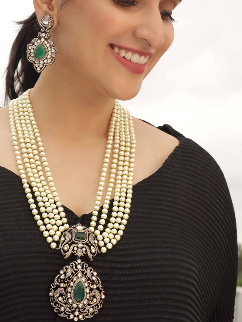 | Product Description | Elegant Multi Layer Pearl Necklace With A Grand Pendant.Beautiful Green Stones And Kundan Work For A Royal Touch.Matching Designer Earrings With Pearl Drops.Perfect For Weddings, Festivals, And Traditional Celebrations Lightweight Yet Gives A Rich And Classy Appearance.Complements Sarees, Lehengas, And Ethnic Gowns Beautifully. |