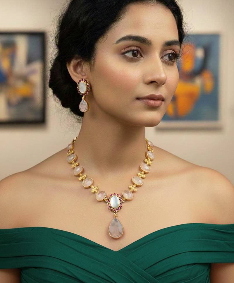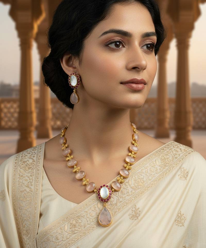 | Product Name | Semi Precious Mop & Pink Quartz Necklace Set In Golden Finish | |