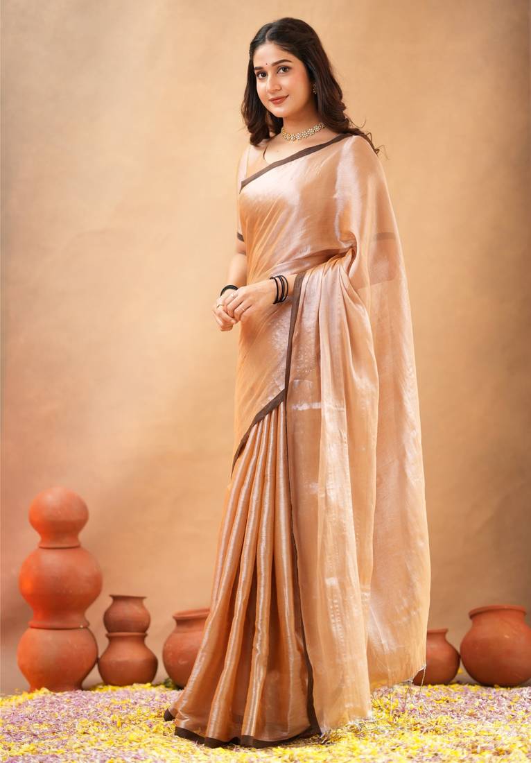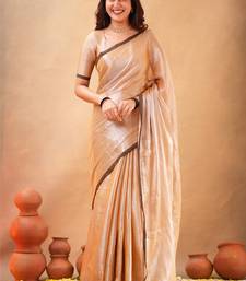 Beige pure tissue cotton handloom south indian style saree with unstitched blouse piece