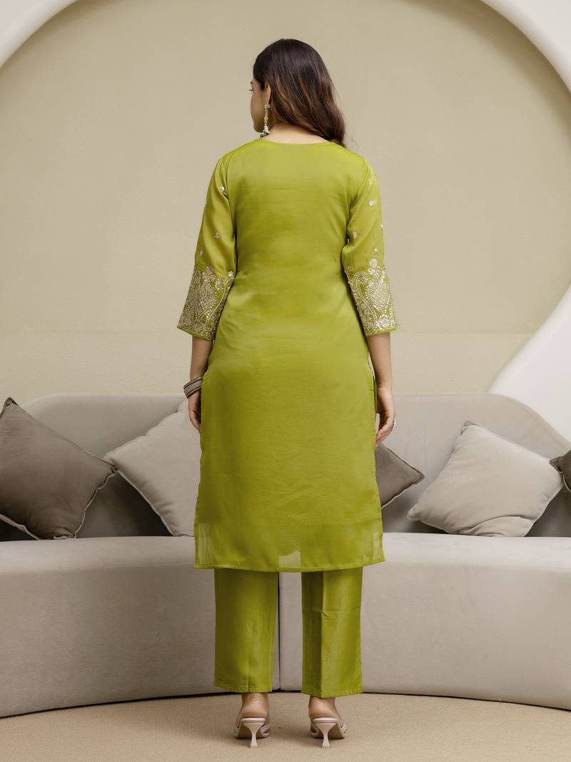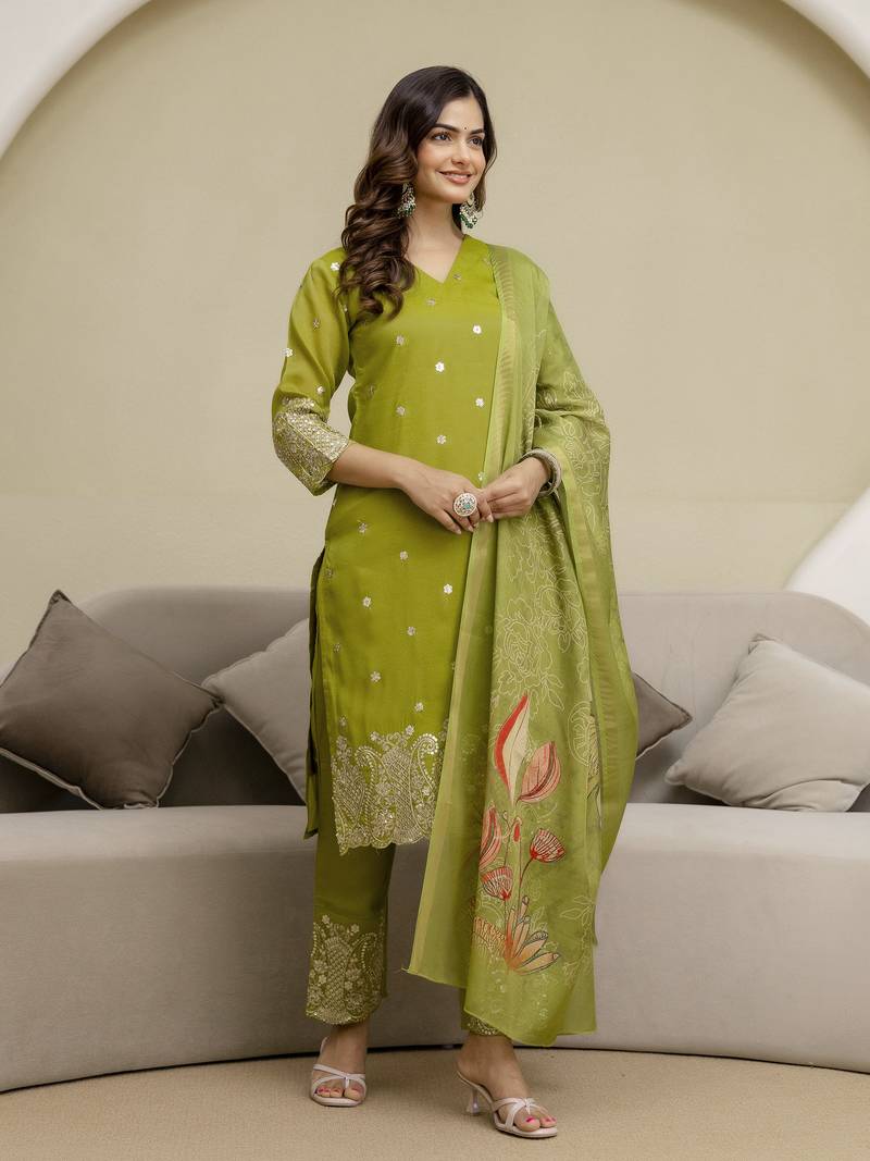 | Product Name | Green Mehendi Look Art Silk Embroidery Sequence Work Salwar Suit Set Kurta Pant With Dupatta | |