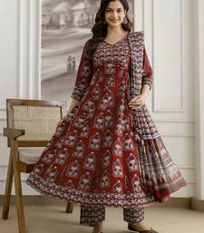 Maroon pure cotton ajrakh block print paper mirror work anarkali kurta pant with dupatta set stitched