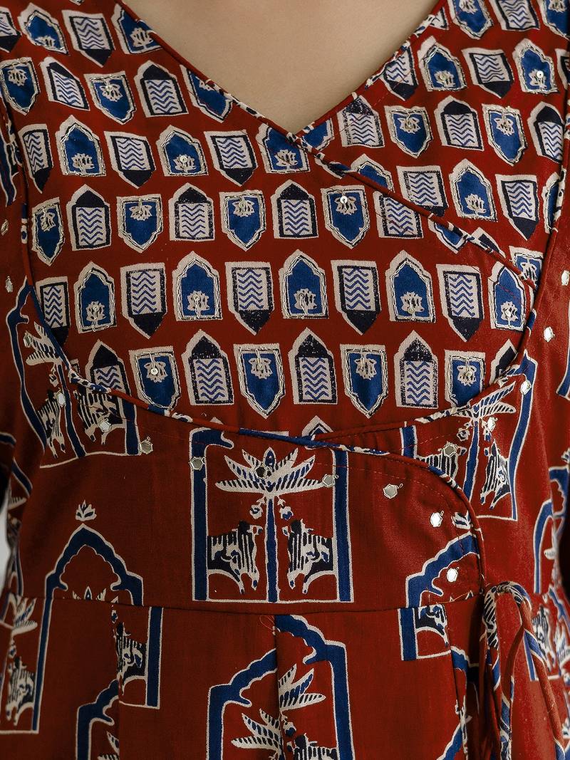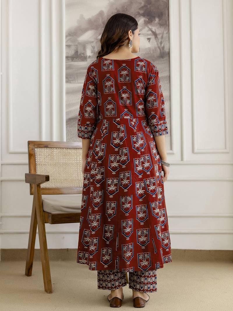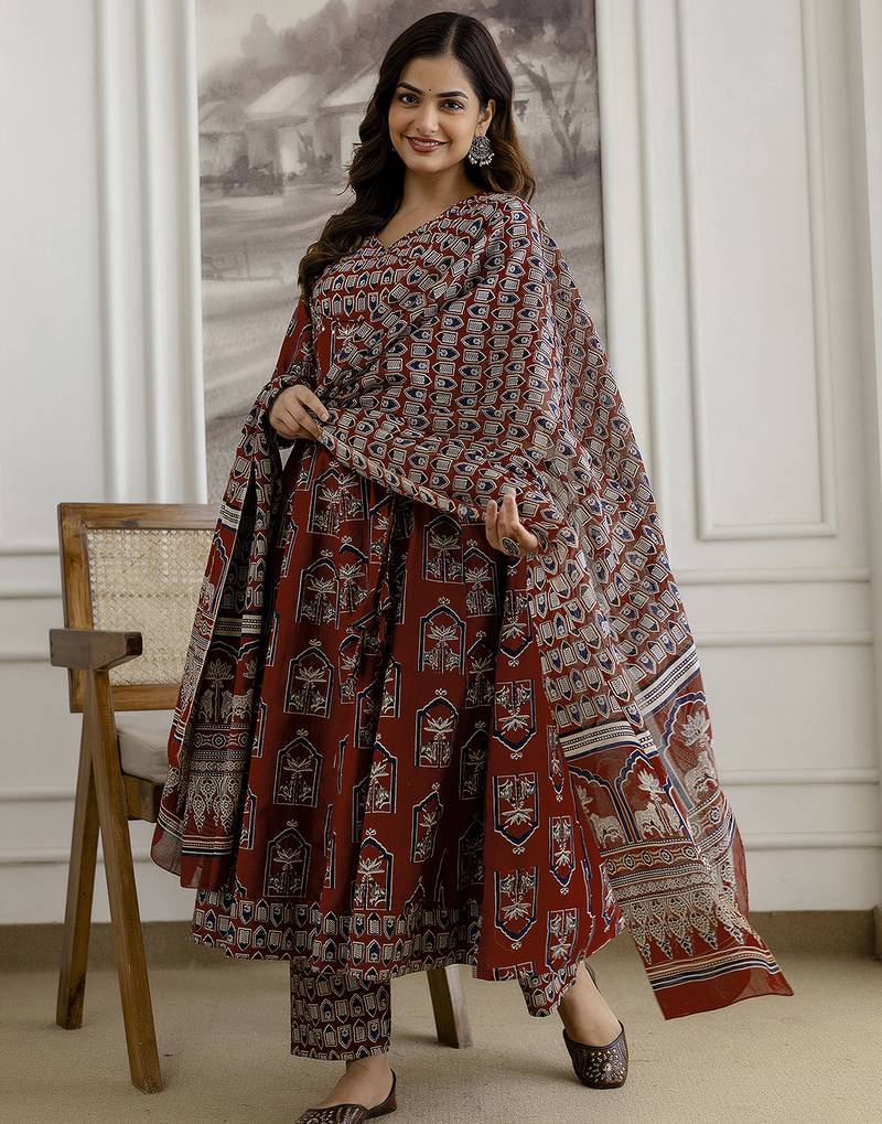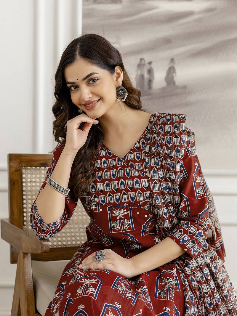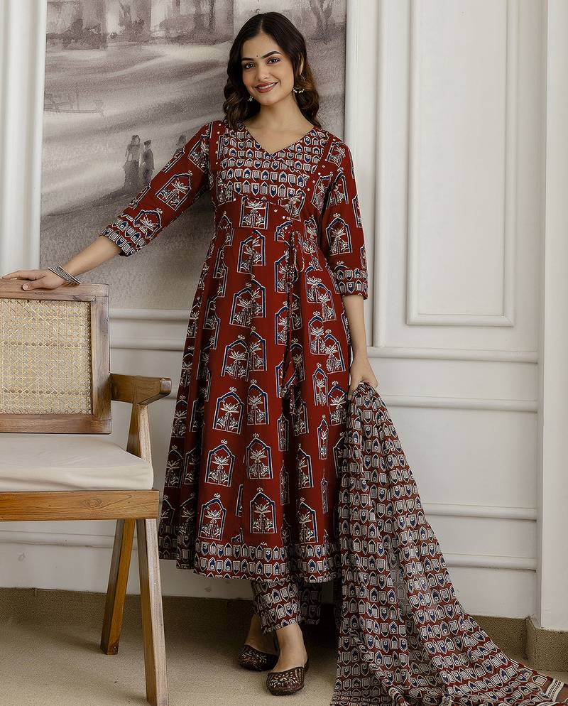 Product Name Maroon Pure Cotton Ajrakh Block Print Paper Mirror Work Anarkali Kurta Pant With Dupatta Set