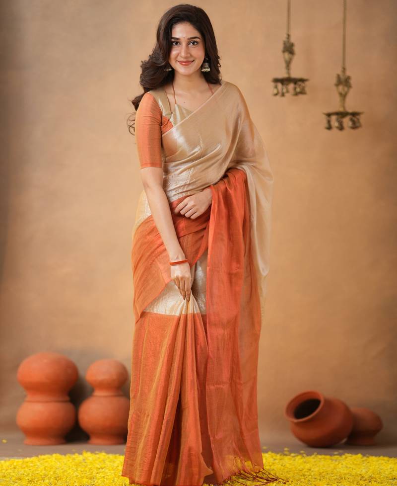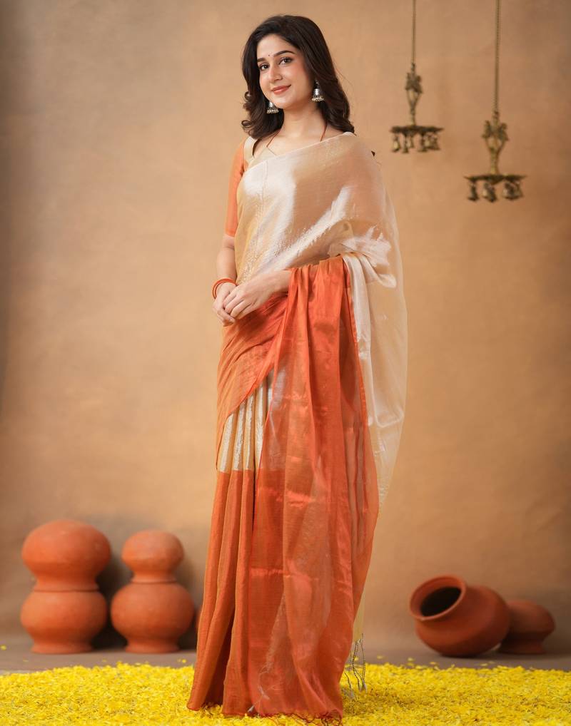 | Product Name | Orange Pure Tissue Cotton Handloom South Indian Style Saree With Unstitched Blouse Piece | |
