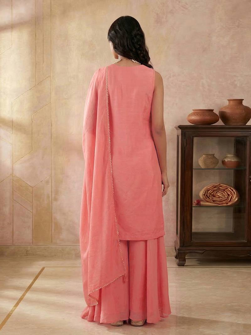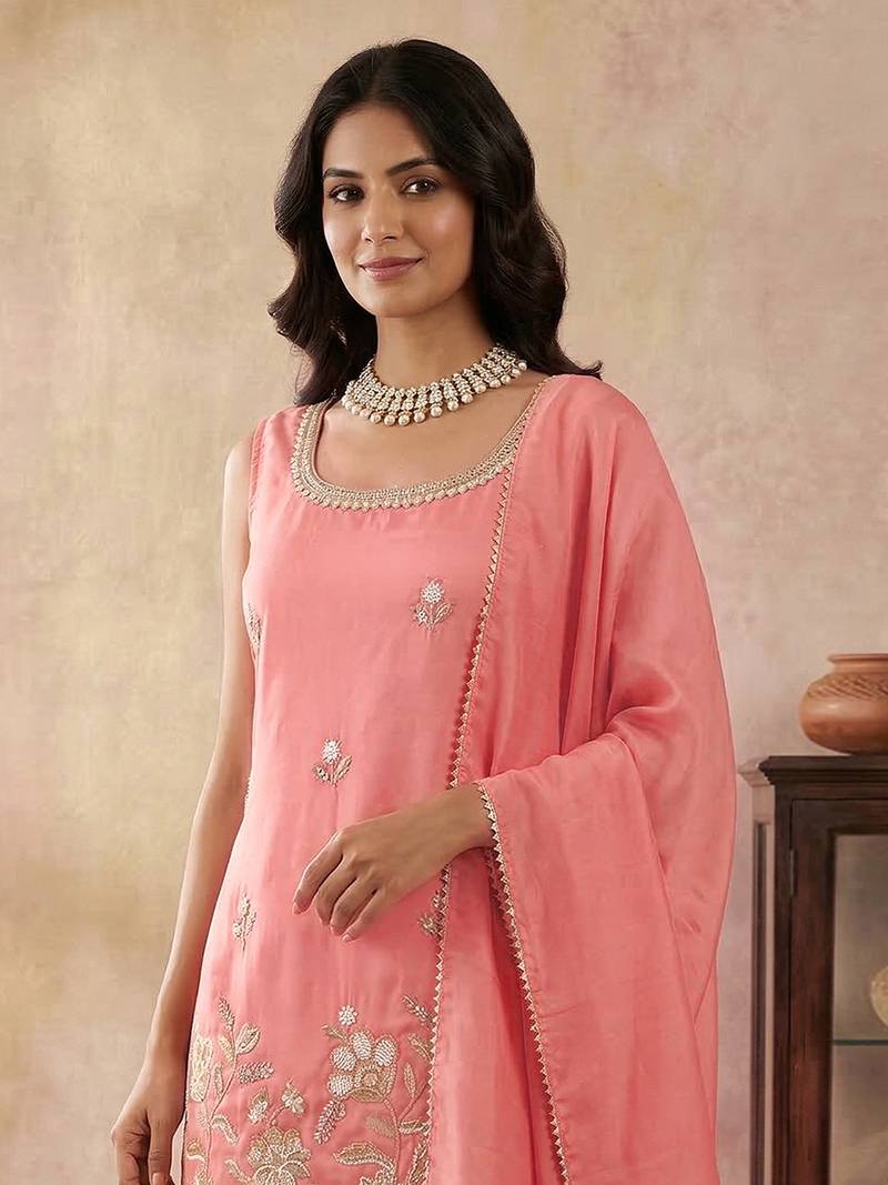 Peach art silk beads embroidery sequence work kurta palazzo set with dupatta stitched