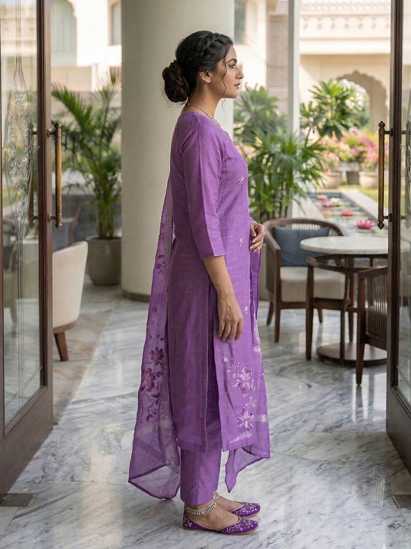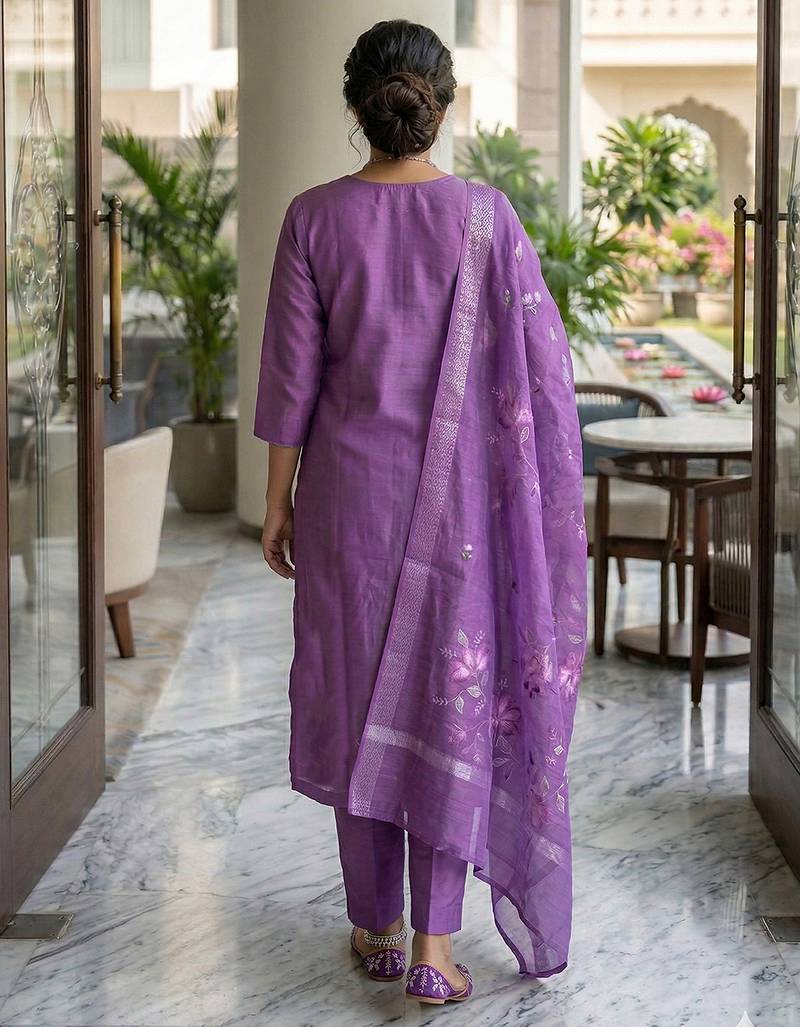 Purple roman silk beads embroidery sequence work kurta pant with dupatta stitched
