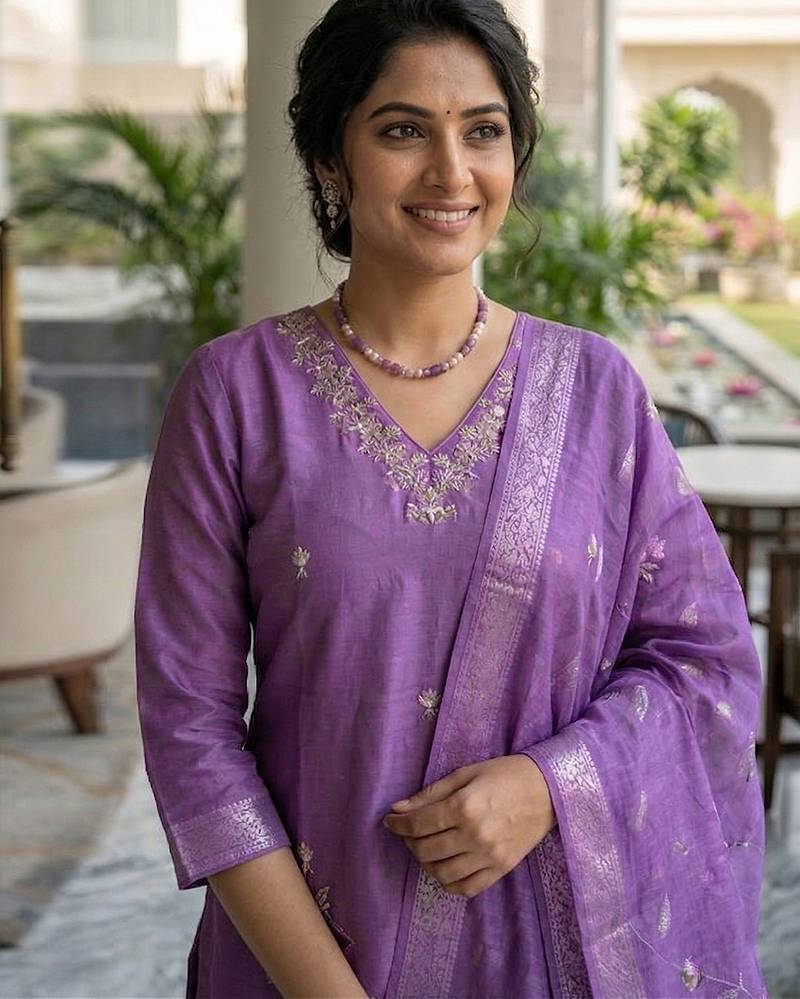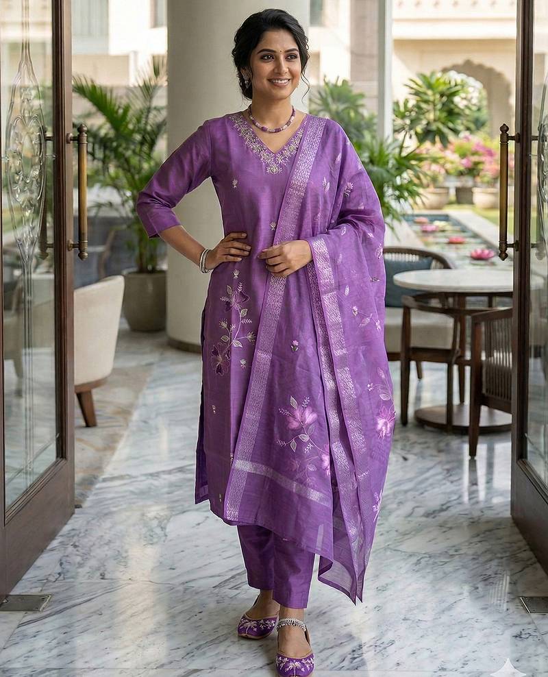 Suit Fabric: Kurta Salwar: Roman Silk; Dupatta: Muslin | Inner: Chanderi Cotton