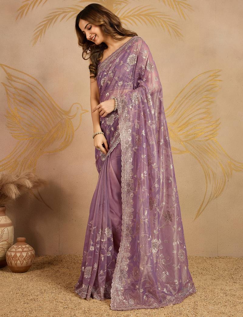 Trendmalls purple soft net embroidery saree with unstitched blouse