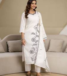 White chanderi cotton embroidery work kurta pant with dupatta set stitched