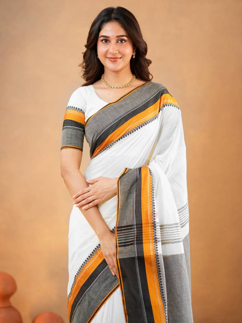 White pure cotton handloom south indian style saree with unstitched blouse piece