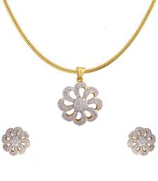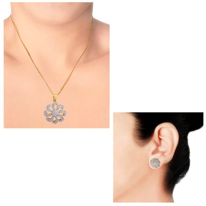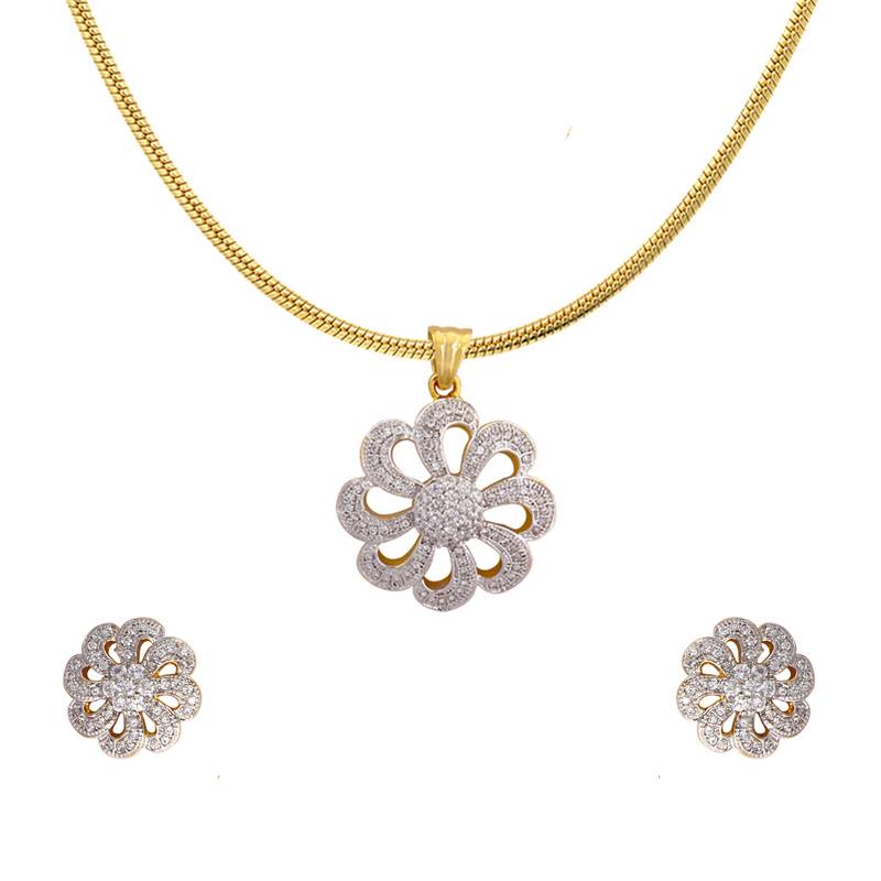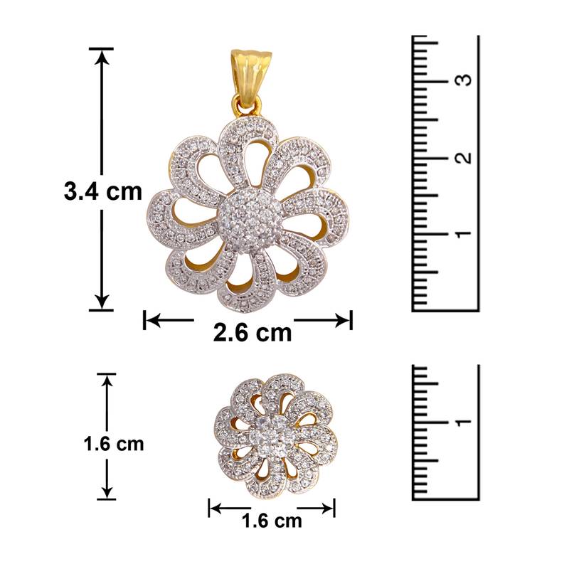 | Product Description | Achieve A Perfect Evening Look With This Shimmering Floral Shaped Set. Sparkling In Clear Crystals, This Attractive Set Comprises Of A Pendant And A Pair Of Earrings. The Subtle Shine Of Golden Brass Based Alloy Along Its Edges Makes The Set Look Quite Appealing. Disclaimer: The Image Shown Is A Zoomed One. Kindly Refer The Dimensions Before Buying. |