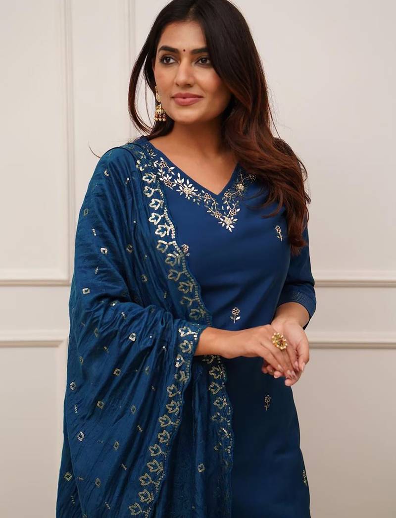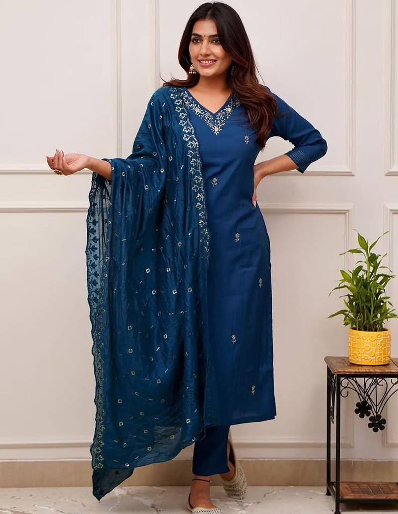 | Product Description | Grace Your Ethnic Collection With This Elegant Dark Blue Kurta Set, Exuding Subtle Charm And Sophistication. The Soft Hued Kurta Features Delicate Sequin And Thread Embroidery Around The Neckline And Scattered Motifs Throughout. Paired With Straight Fit Pants And A Matching Dupatta Adorned With Floral Embroidery And Shimmer Work, This Set Is Perfect For Festive Celebrations, Pooja Ceremonies, Or Elegant Casual Wear. |