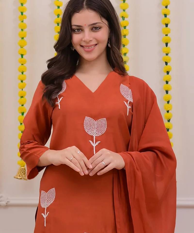 | Product Description | This Elegant Women’s Kurta Set Comes In A Soft Cotton Blend Fabric Offering A Comfortable And Breathable Feel For All Day Wear. The Kurta Features Minimal Embroidered Lotus Motifs That Add A Refined And Graceful Charm To The Overall Look. Paired With Matching Pants And A Lightweight Chanderi Dupatta, The Outfit Creates A Perfectly Balanced Traditional Appearance. Its Subtle Pattern, Smooth Texture, And Classy Color Make It Ideal For Festive Events, Family Gatherings, And Everyday Ethnic Styling. |