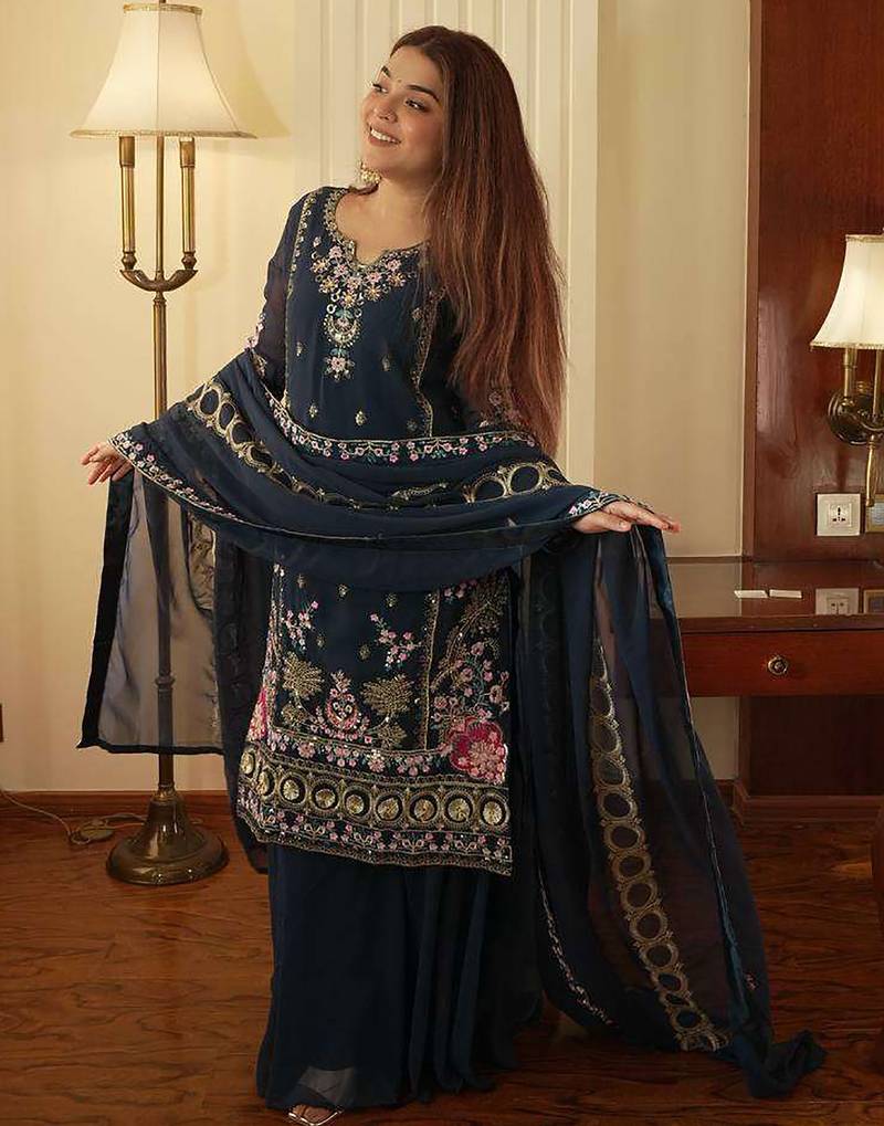 | Product Description | Enhance Your Festive Wardrobe With This Elegant Women’s Kurta Palazzo With Dupatta Set, Crafted In Soft, Flowy Georgette Fabric For A Graceful Drape. The Kurta Is Adorned With Intricate Floral And Traditional Embroidery Work Across The Neckline, Sleeves, And Hem, Creating A Rich, Detailed Pattern. Delicate Motifs Scattered Throughout Add Depth And Charm To The Overall Design. Paired With Matching Palazzo And A Beautifully Embellished Dupatta, This Ensemble Offers A Regal, Refined Appearance—Perfect For Weddings, Festive Celebrations, And Party Wear Occasions.Women Kurta Pant Dupatta Set, Georgette Kurta Set For Women, Wedding Wear Kurta Set, Party Wear Kurta Set, Festive Wear Kurta Set, Pakistani Kurta Set, Pakistani Style Kurta Palazzo, Embroidered Kurta Pant Set, Women Ethnic Wear Georgette, Designer Kurta Set, Kurta Sharara Set Women, Kurta Palazzo Set Women, Wedding Kurta Palazzo Set, Party Wear Ethnic Dress, Traditional Kurta Set For Women, Festive Pakistani Kurta Set, Women Wedding Ethnic Wear, Georgette Embroidered Suit |