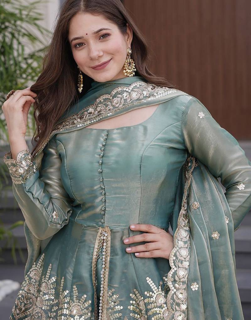 | Product Description | Elegant Women’s Sharara Suit Set Crafted In Premium Tissue Fabric, Offering A Rich Sheen And Graceful Fall For A Luxurious Look. The Kurta Features Intricate Sequin And Thread Embroidery With Scalloped Patterns Along The Hem And Sleeves, Adding Depth And Festive Charm. Paired With Matching Pants Detailed With Coordinated Embroidery, It Creates A Refined And Balanced Silhouette. |