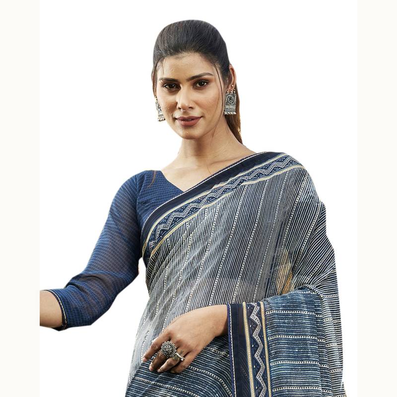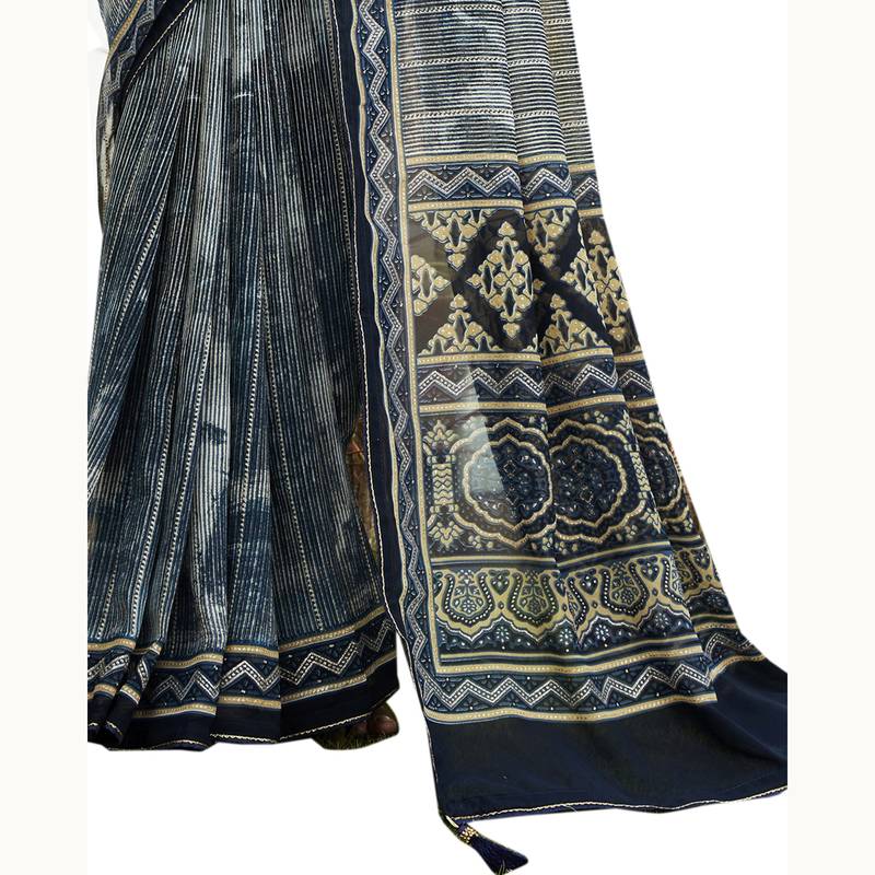 | Product Description | Greyish Blue Georgette Print Stripes With Viscous Border Abstract Prints Festive Saree |