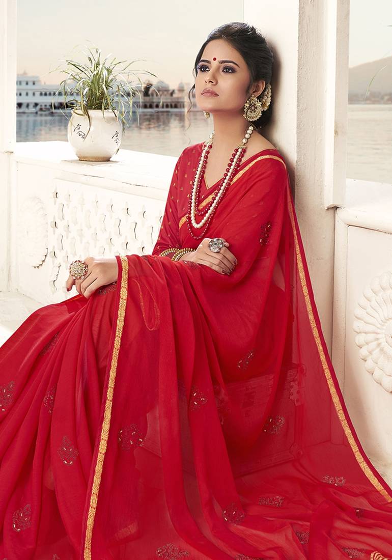 | Product Description | Triveni Red Chiffon Casual Wear Embelished Saree With Silk Blouse Piece |