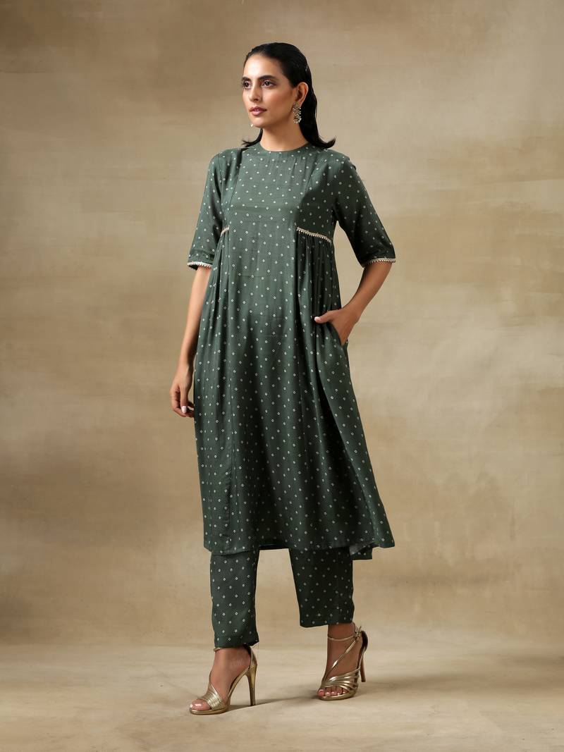 Dark green bandhani printed silk side gathered kurta pant set