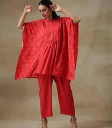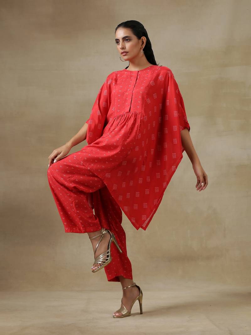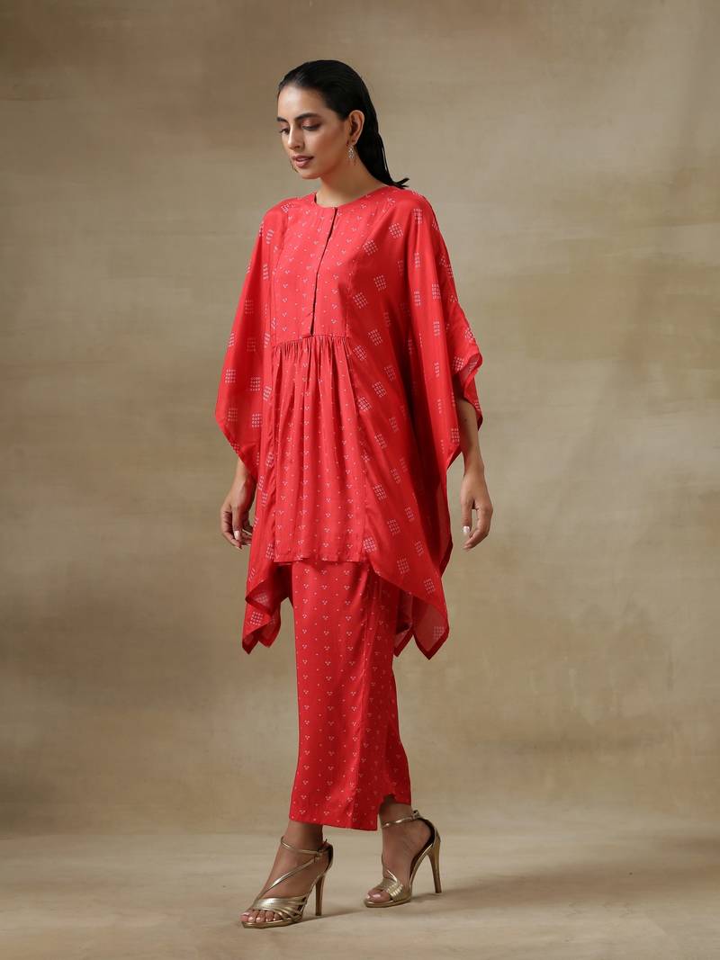 | Product Name | Red Bandhani Printed Silk Kaftan Gathered Co Ord Set | |