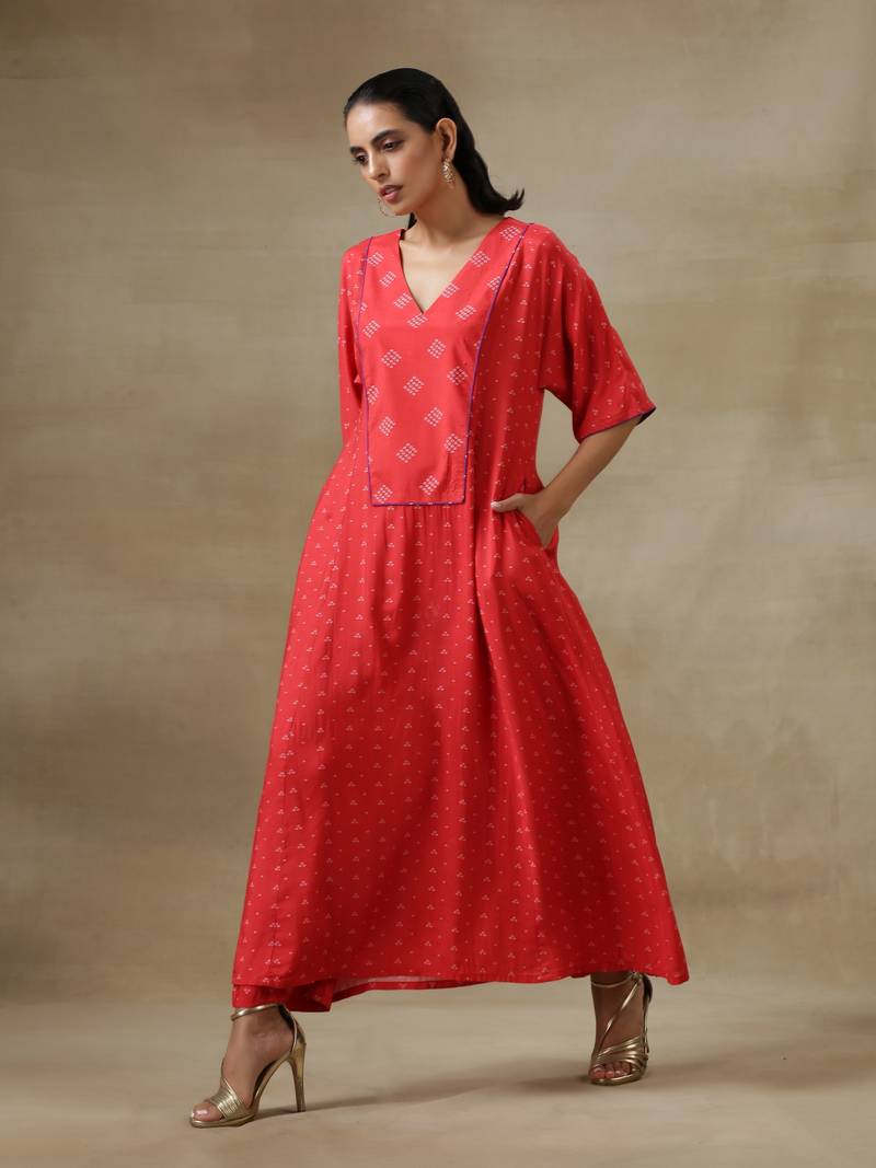 | Product Description | Red Three Dot Bandhani Printed Long Kurta Set With Red Rhombus Dot Bandhani Printed Yoke. It Has Extented Sleeves, Pockets On Both The Sides And Purple Color Piping Details. Paired With Red Three Dot Bandhani Printed Pair Of Pants. Complete Set Is In Printed Musin Silk. Style With Earings, Clutch And Pair Of Mules To Complete The Look. The Product Have No Lining. Dry Clean Only. Actual Product Color May Vary From The Product Image Shown. |