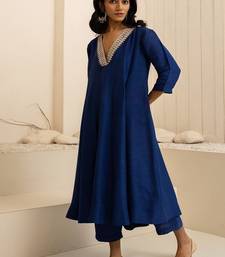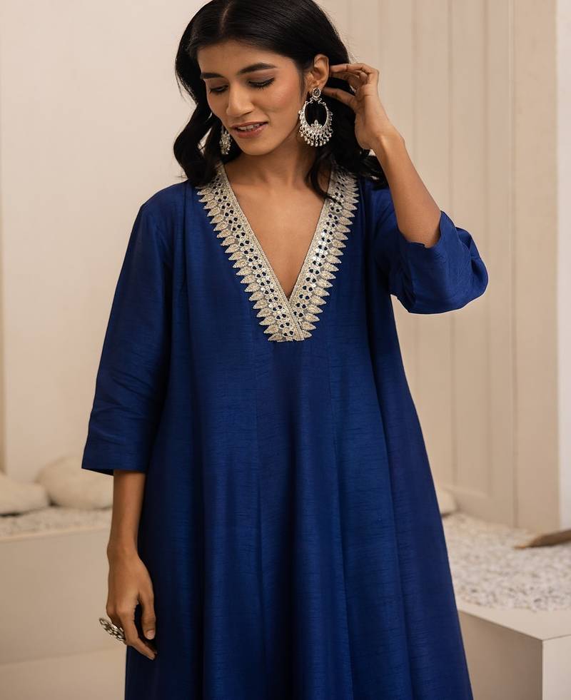 Product Description | Top: Navy Blue Kalidaar Loose Fit Kurta With Intricate Cutwork Zari V Neck Bottom: Navy Blue Straight Style Pants