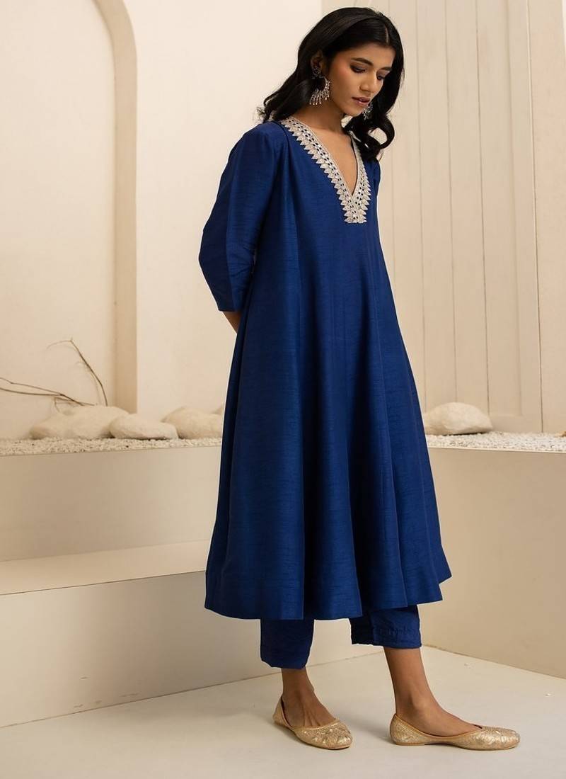 Product Name | Navy Blue Plain Dola Silk Anarkali Set With Neckline Embroidery | |