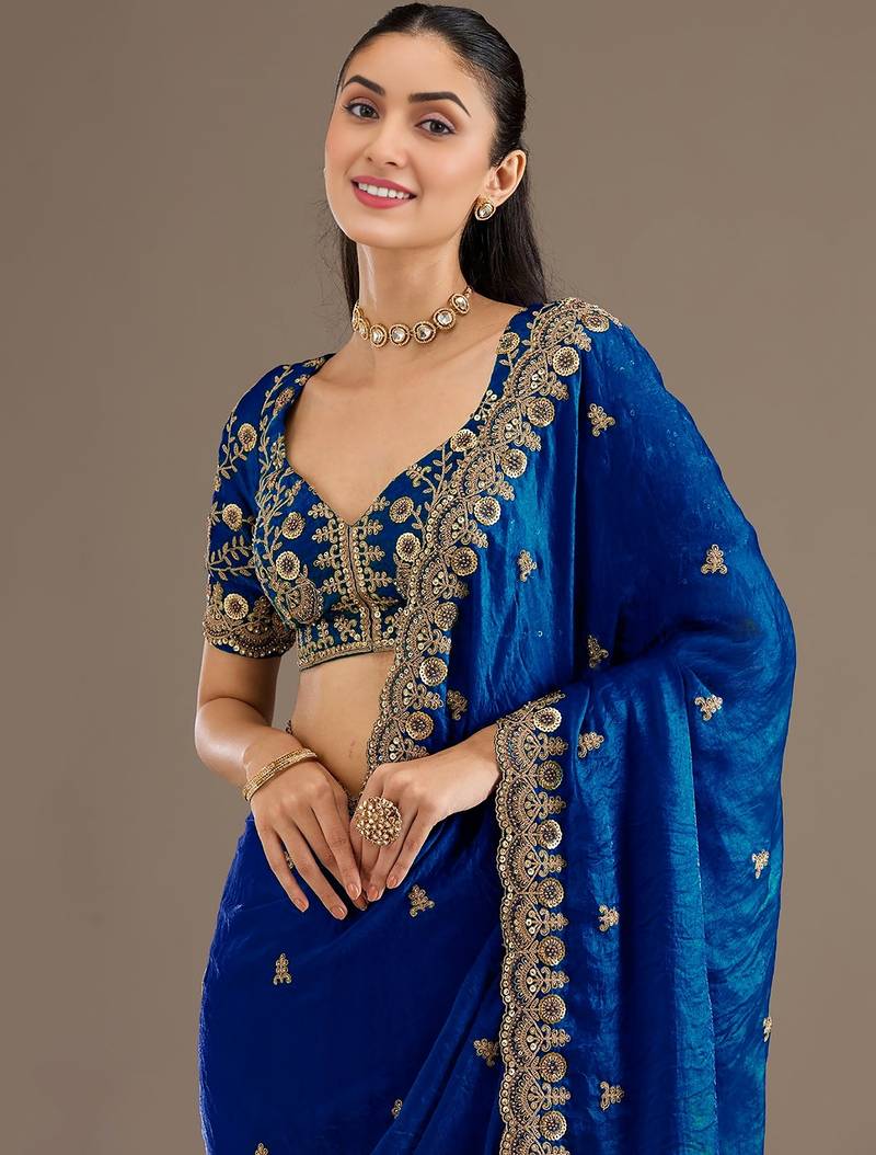 | Product Name | Amazing Royal Blue Embroidered Tissue Silk Reception Wear Saree With Blouse | |