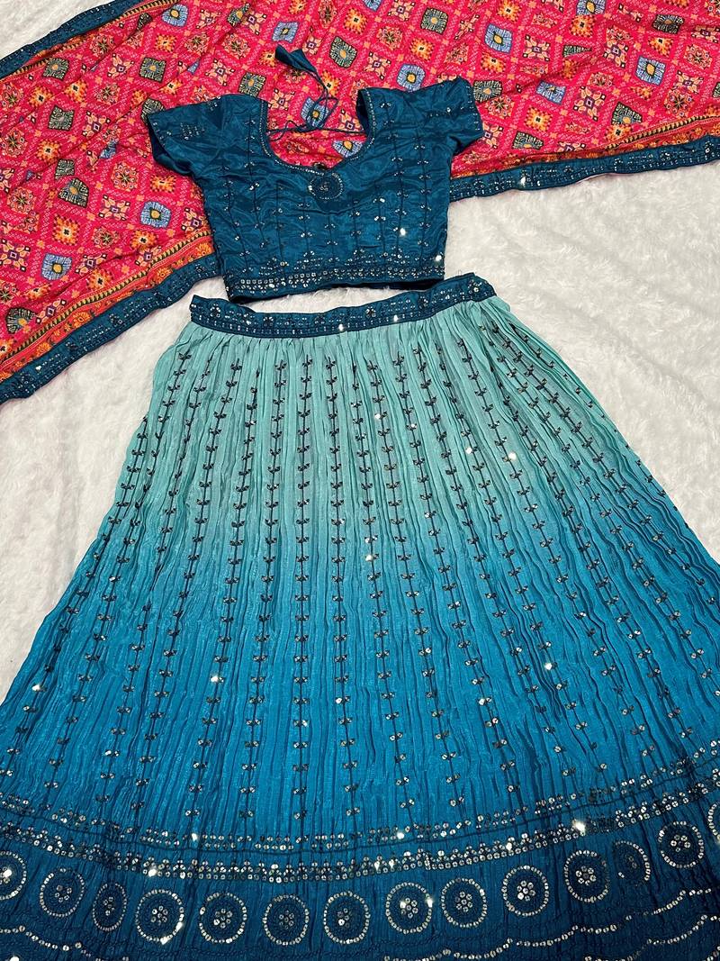 | Product Description | This Exquisite Blue Ombre Georgette Lehenga Choli Set Features A Stunning Gradient Transition From Icy Sky To Deep Navy. Adorned With Intricate Mirror Work And Sequin Embroidery, It Is Paired With A Vibrant Pink Bandhani Dupatta, Creating A Striking Color Contrast Perfect For Weddings And Festive Celebrations. |
