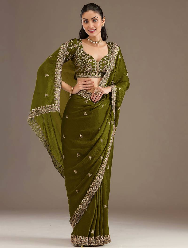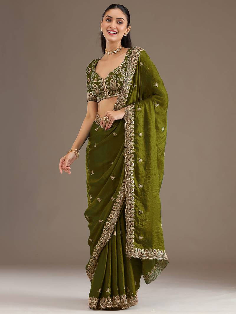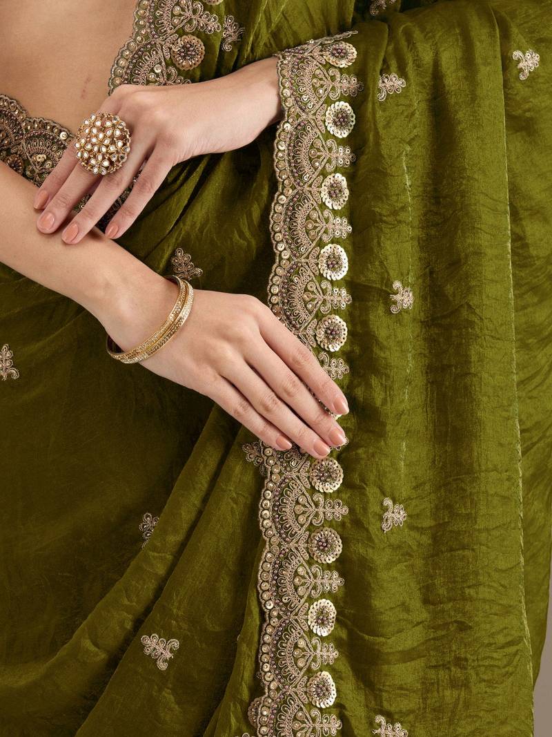Charming olive green embroidered tissue silk mehendi wear saree with blouse