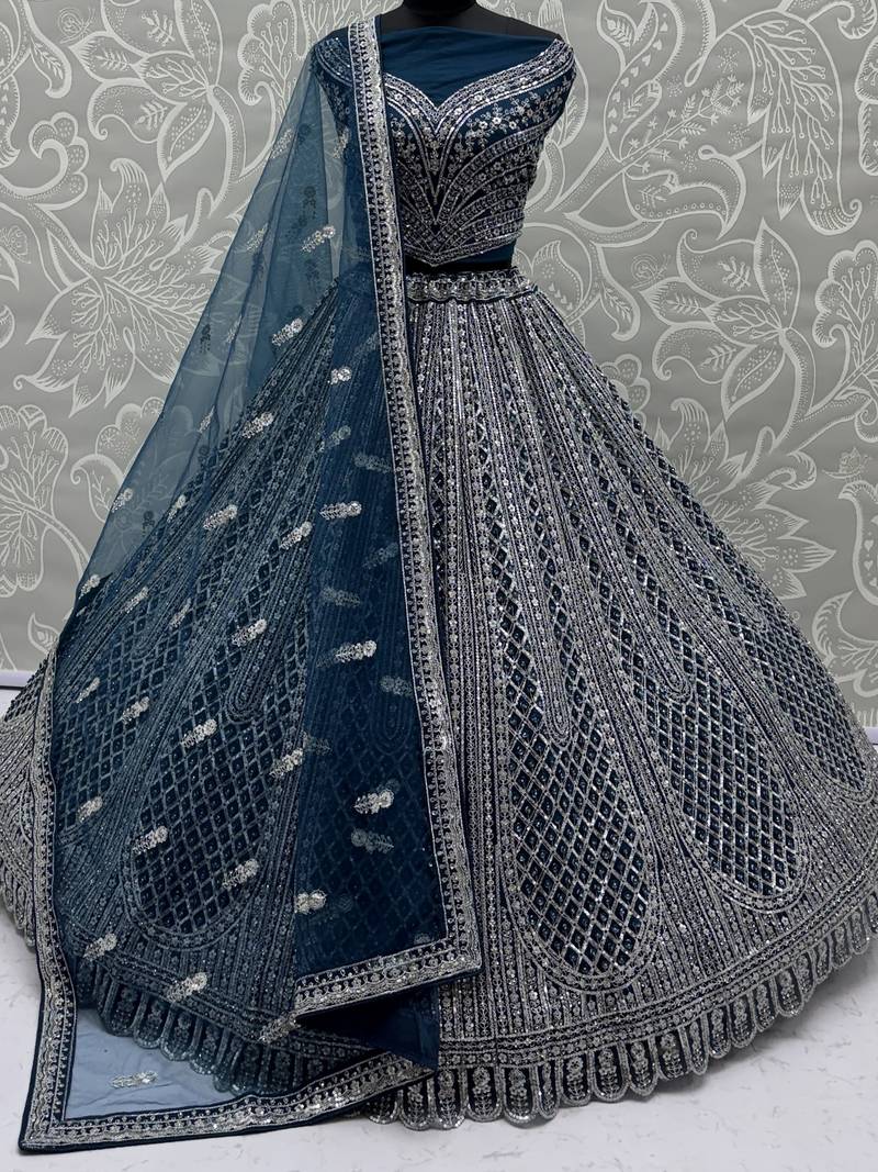 This Elegant Lehenga Comes In A Rich, Deep Teal Blue Shade, Crafted From Heavy Net Fabric That Gives A Graceful Fall And Royal Appeal. It Is Beautifully Adorned With All Over Sequin Work, Butterfly Motifs, Multi Thread Embroidery, And Zircon Diamond Studded Detailing For A Luxurious Shimmer.
