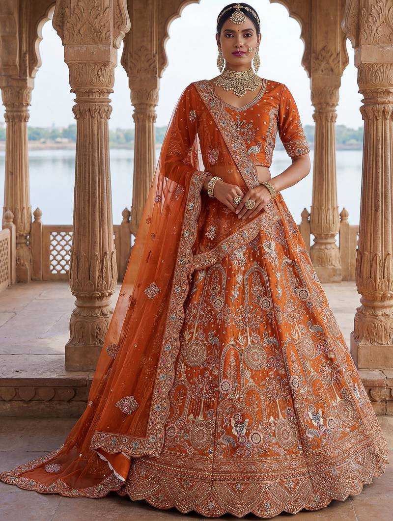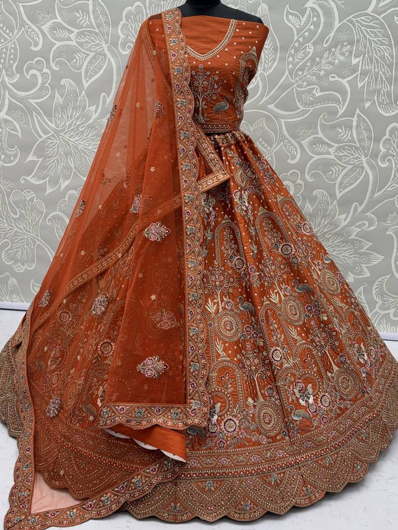 | Product Description | The Lehenga Comes In A Rich Rust Orange Silk Fabric Beautifully Adorned With Golden Dori Work Along With Intricate Chappat Zari And Thread Embroidery For A Regal Bridal Appeal. Enhanced With Shimmering Sequins And Diamond Work, The Outfit Is Further Elevated By Its Grand 4 Meter Plus Flair That Creates A Majestic And Voluminous Silhouette.