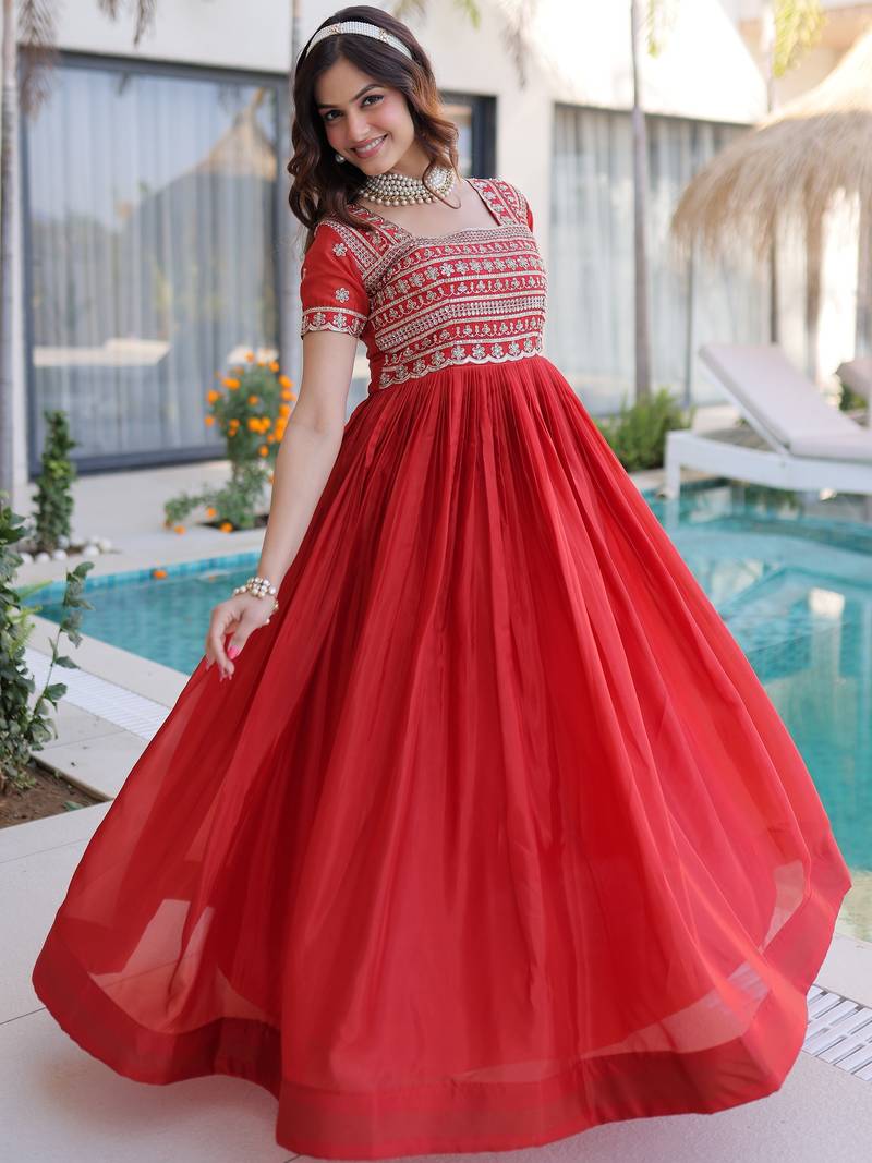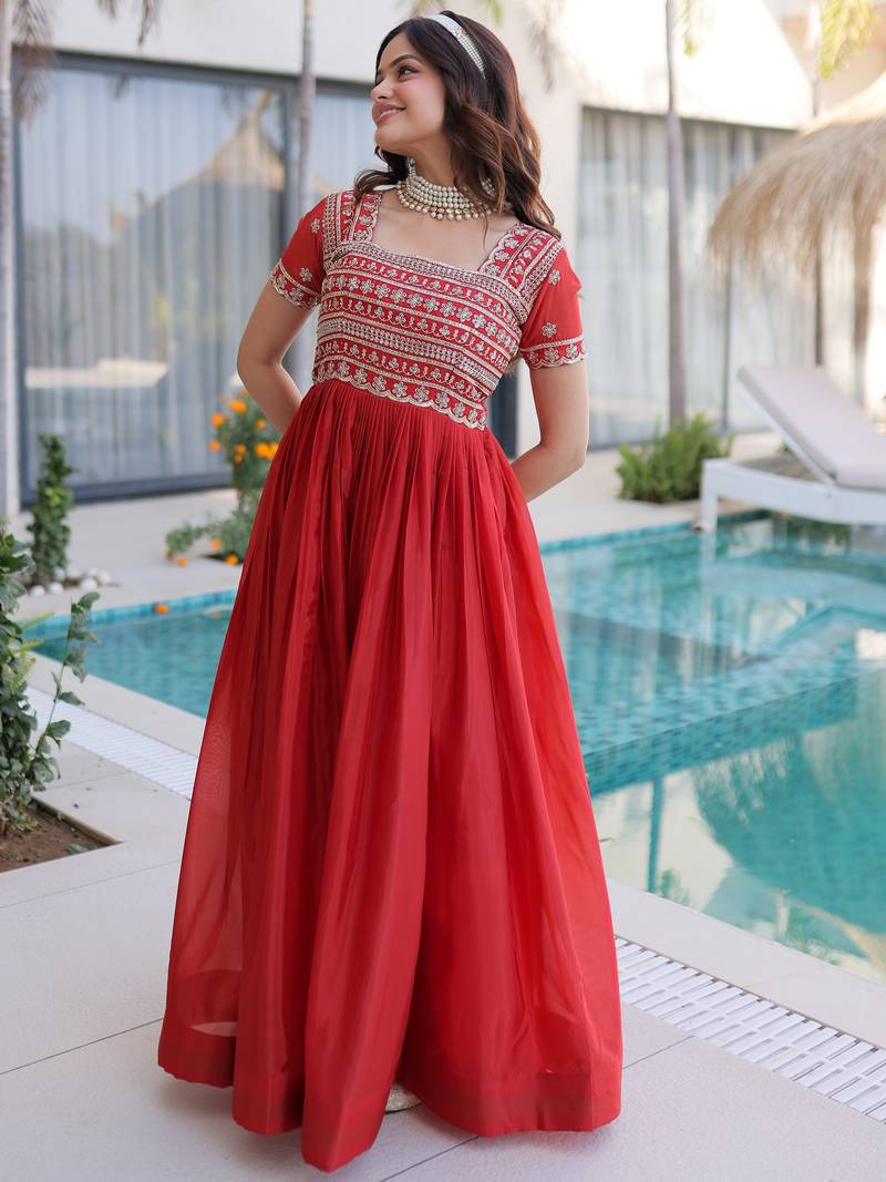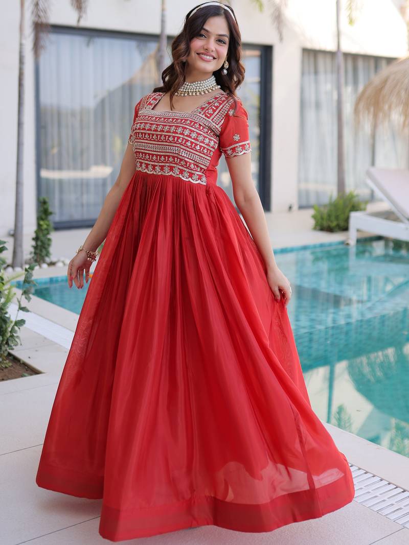 Perfect For Wedding Celebrations, Festive Gatherings, Receptions, Engagement Ceremonies, And Special Occasions, This Orange Embroidered Gown Delivers A Bold And Elegant Ethnic Statement.