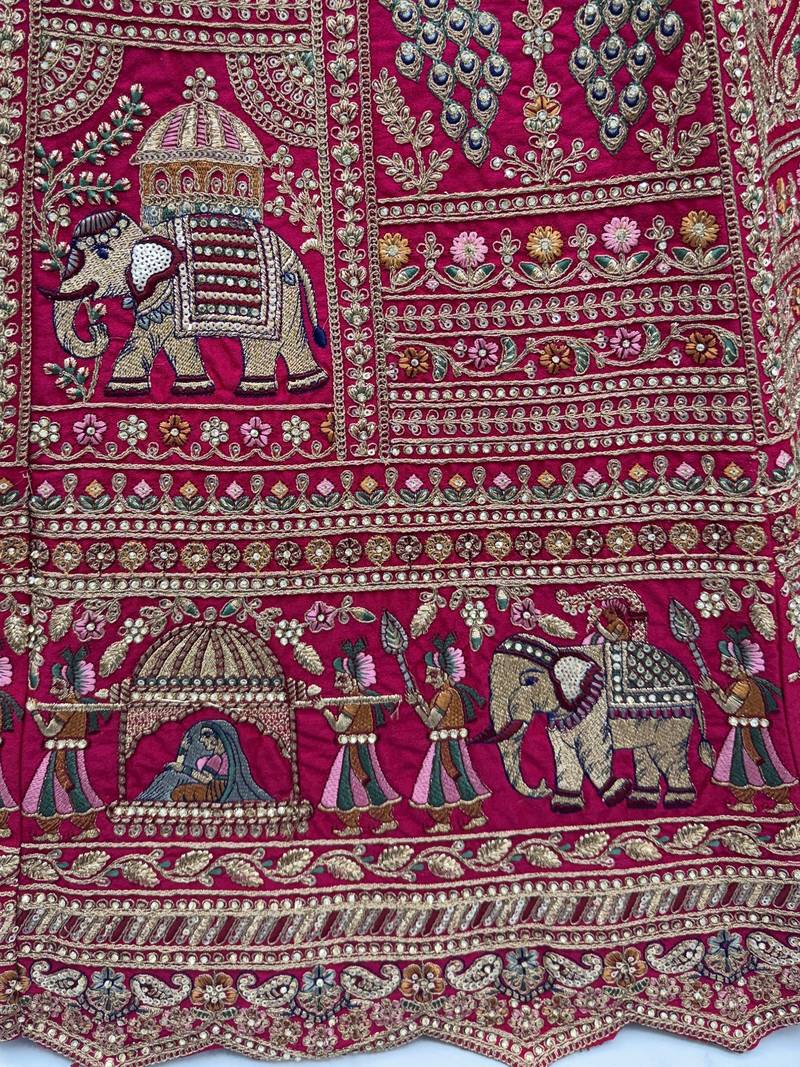 | Product Description | This Stunning Bridal Lehenga Comes In A Rich, Deep Red Silk Fabric, Beautifully Enhanced With Heavy Dori Embroidery And Intricate Various Figure Motifs Across The Panels. Chappat Zari, Fine Thread Detailing, Sparkling Sequins, And Diamond Studded Embellishments Add A Regal Charm, While The Grand 4+ Meter Flair Creates A Majestic Bridal Silhouette. The Bridal Designer Silk Blouse In Matching Red Tone Features Identical Embroidery And Figure Work As The Lehenga, Including Detailed Backside Embroidery For A Luxurious Finish. The Elegant Double Soft Net Dupatta In Matching Red Is Adorned With Delicate Butti Motifs And Finished With Four Side Lace Borders, Completing The Royal Bridal Ensemble. The Lehenga Comes With Standard Stitching Supported By Cancan And Canvas Attachment, Offering A Comfortable, Free Size Fit Adjustable Up To Size 42. The Blouse Fabric Is Provided As A 1.2 Meter Unstitched Piece, Allowing Custom Tailoring For A Perfect Bridal Fit. This Grand Red Bridal Lehenga Set Is Perfect For Wedding Ceremonies, Receptions, And Traditional Bridal Functions Where Royal Elegance Is Desired. Its Heavy Embroidery And Luxurious Detailing Make It An Ideal Choice For Brides Seeking A Timeless, Heritage Inspired Wedding Look. Disclaimer: Slight Colour Variation May Occur Due To Photographic Reasons. |
