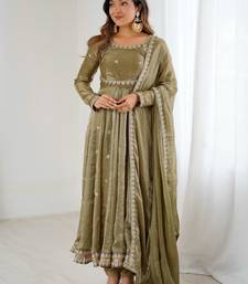 The Gown Features A Graceful Olive Green Shade Crafted In Luxurious Silk Fabric, Creating A Rich And Elegant Festive Appeal. It Is Beautifully Detailed With Coding And Sequence Work On Both Front And Back, Enhanced With A Soft Micro Inner For Comfort And Smooth Fall.