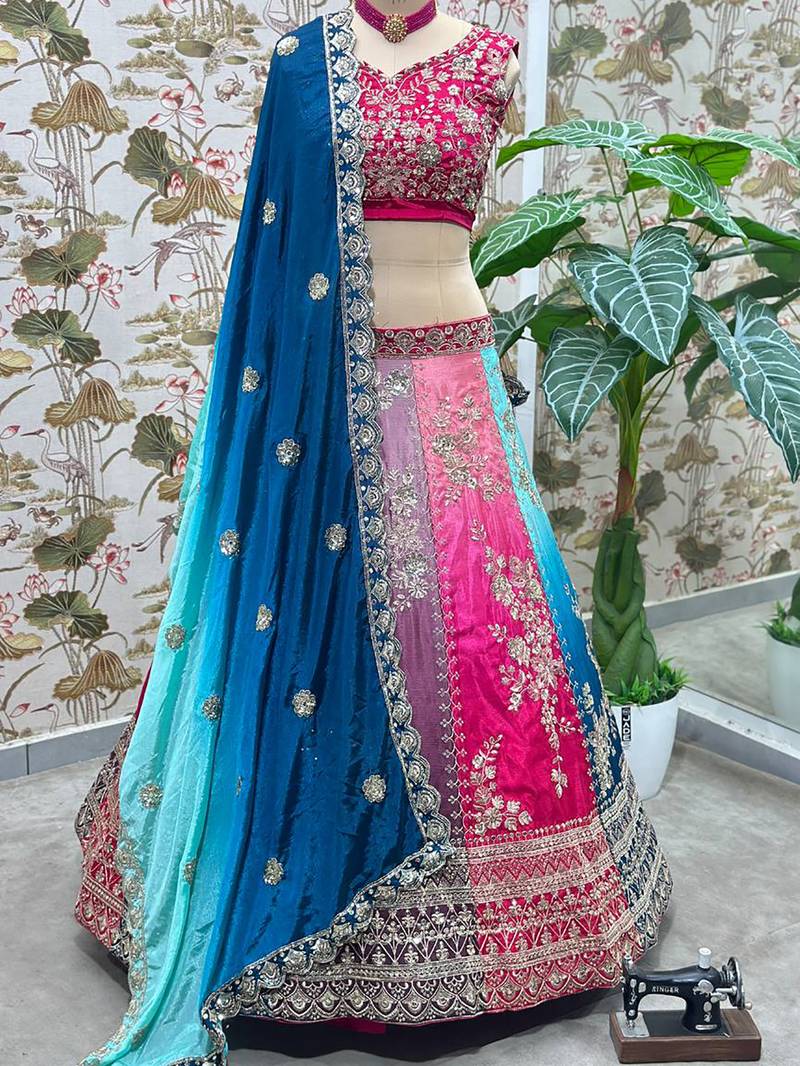 | Product Description | Make A Bold Statement With This Exquisite Multicolored Silk Lehenga, Featuring A Stunning Fusion Of Deep Pink, Teal, And Navy Blue Panels. The Ensemble Is Meticulously Detailed With Heavy Gold Zari And Floral Embroidery. Complemented By A Contrasting Teal Dupatta, This Luxurious Set Is The Ultimate Choice For Festive Celebrations And Grand Wedding Galas. |
