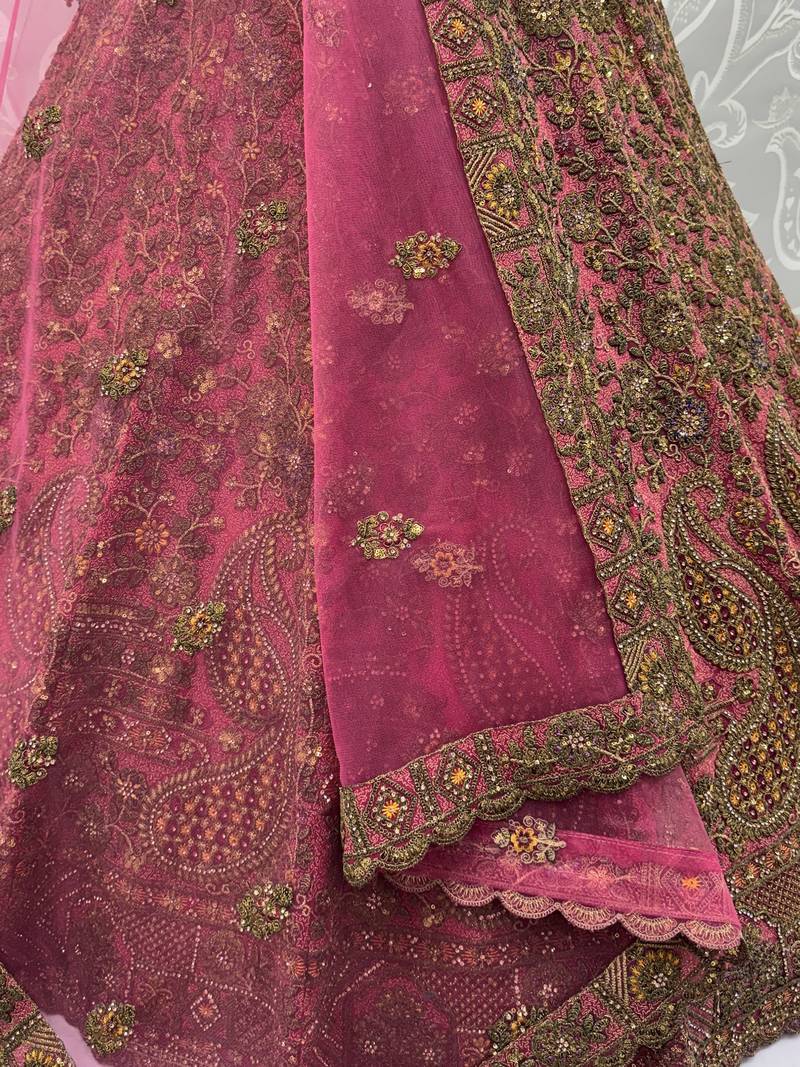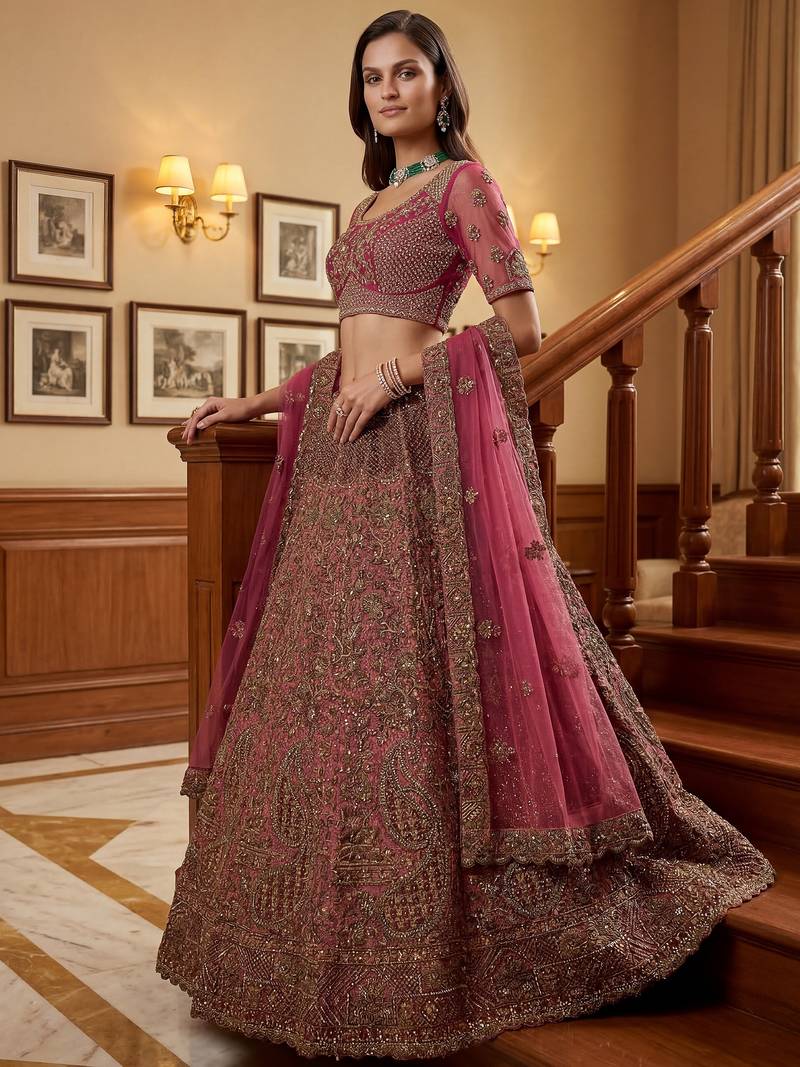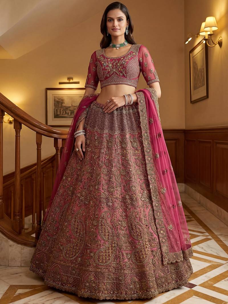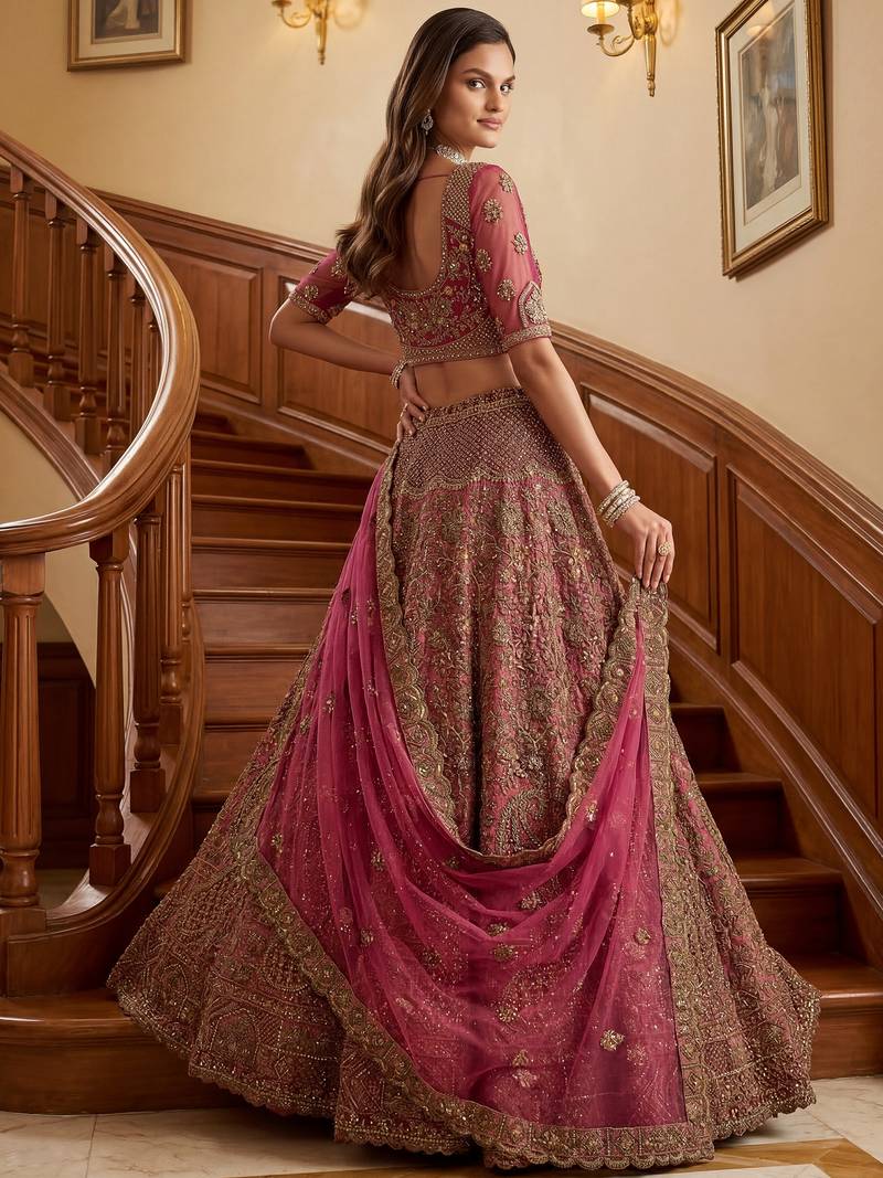| Product Description | This Stunning Lehenga Features A Rich Deep Rani Pink Base Blended With Antique Gold Tones, Creating A Vibrant And Royal Look. Intricate Patterns Highlight Shades Of Wine, Maroon, And Subtle Bronze, With Sequins And Zircon Adding A Soft Golden Shimmer.