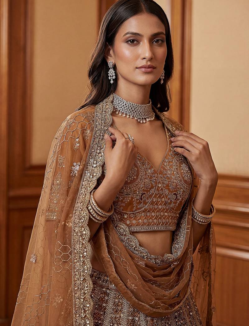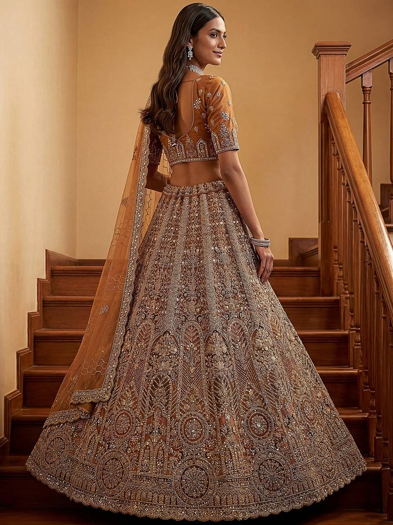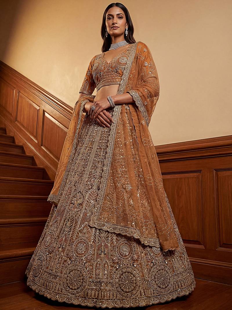 | Product Description | The Lehenga Features A Rich Warm Brown Base With Rust And Bronze Undertones, Highlighted By Antique Gold Zari And Soft Multi Tone Embroidery. The Overall Palette Gives A Regal And Timeless Festive Look, Perfect For Statement Styling.