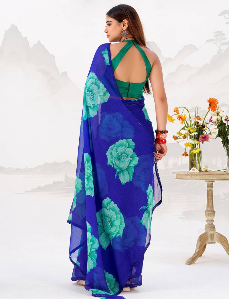 | Product Description | This Elegant Saree Is Crafted In A Rich Royal Blue Chiffon Base, Beautifully Highlighted With Large Aqua Green Floral Prints That Create A Fresh And Graceful Look. The Lightweight Chiffon Fabric Flows Effortlessly, While The Delicate Lace Border Adds A Refined Finish To The Overall Floral Design.
