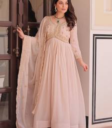 Stylish peach thread work georgette festival wear gown with dupatta stitched