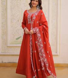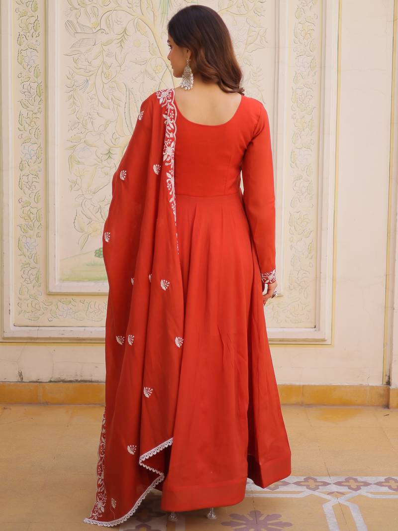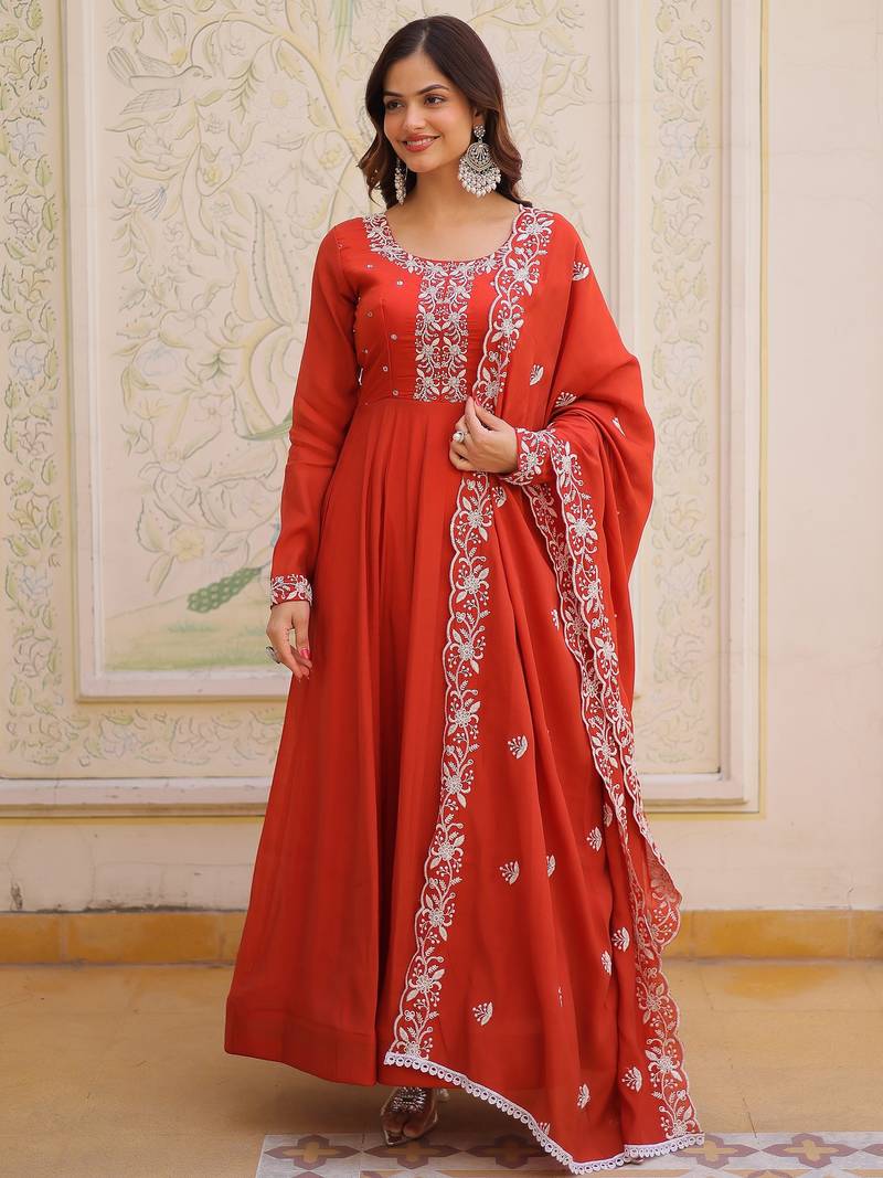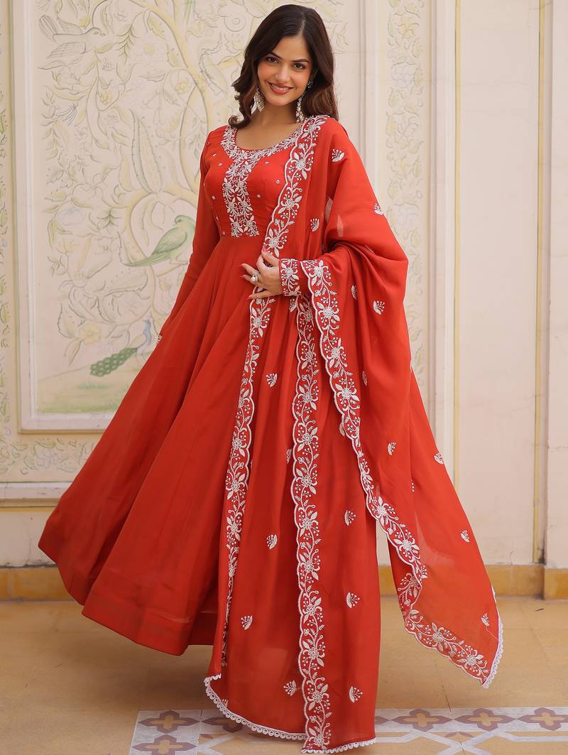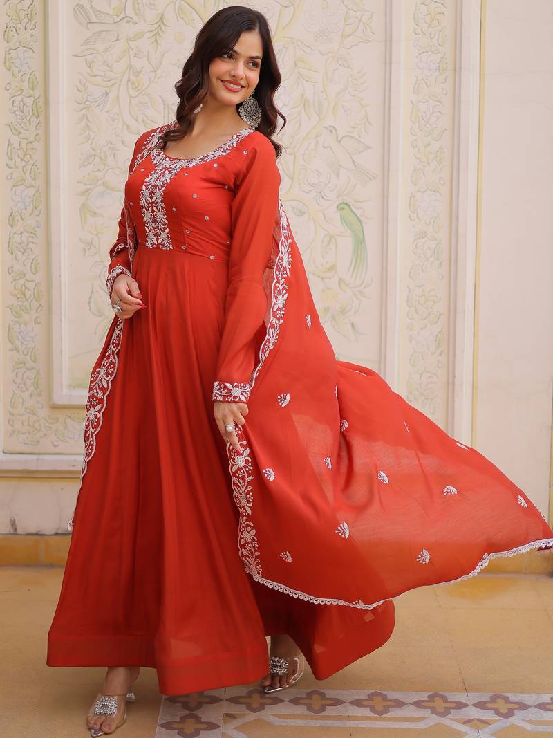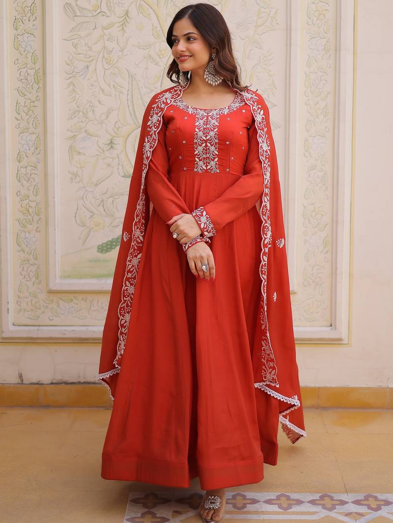 Sweet rust orange bead work chanderi wedding wear gown with dupatta stitched