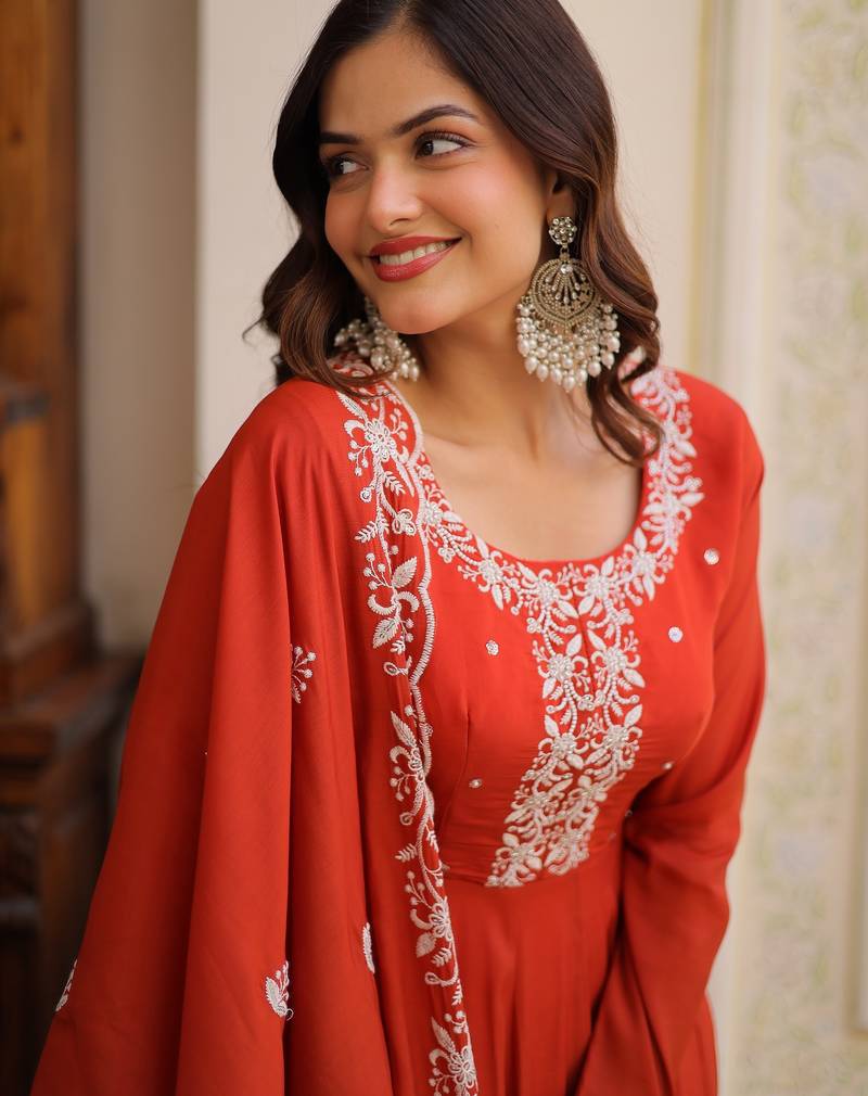The Gown Is Crafted In Rich Rust Orange Mal Chanderi Fabric, Giving The Outfit A Warm And Elegant Look. It Features Delicate Beads Embroidery In Soft Off White Tones Around The Neckline And Front Panel, Creating A Beautiful Contrast With The Vibrant Orange Base.